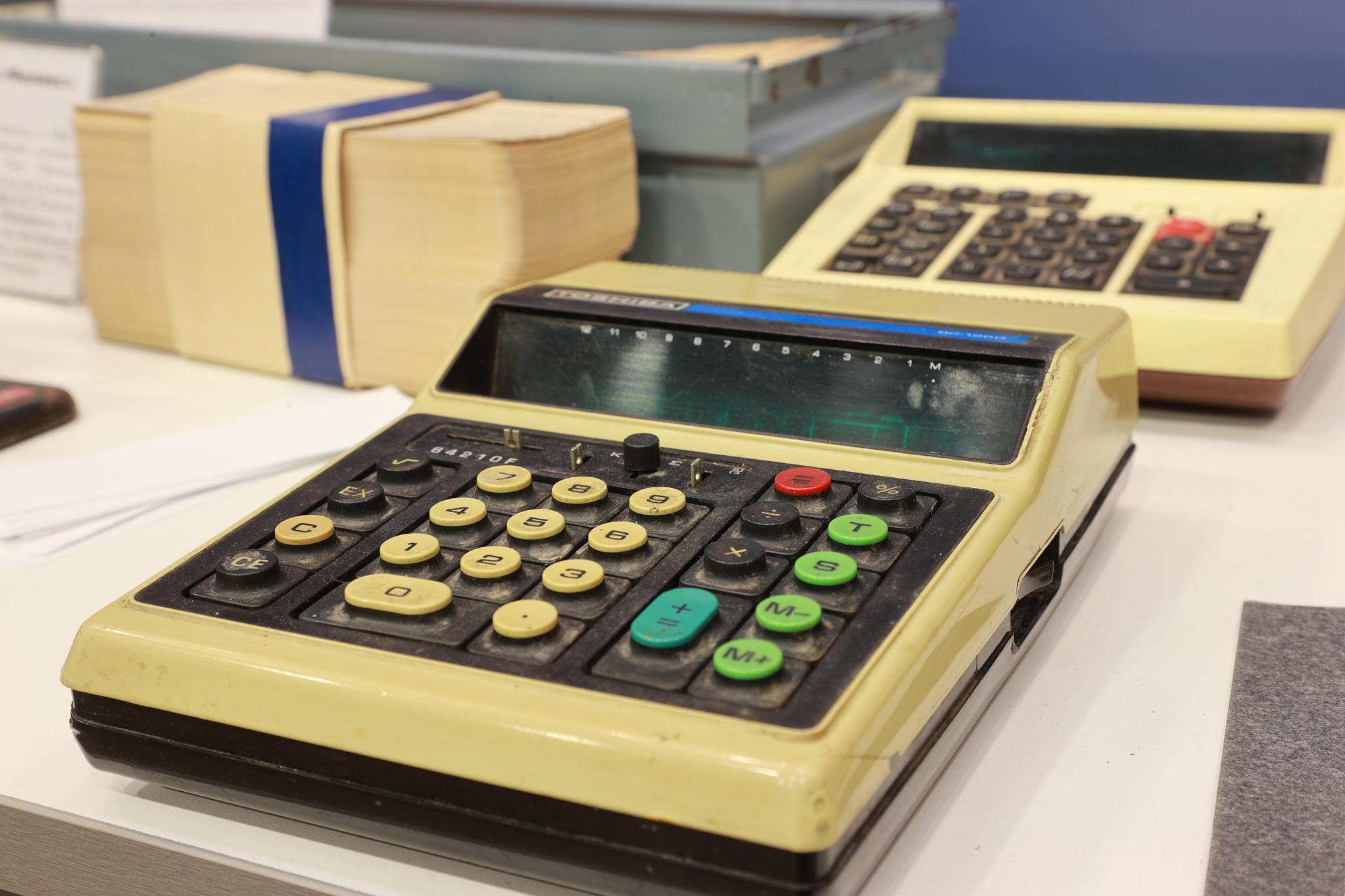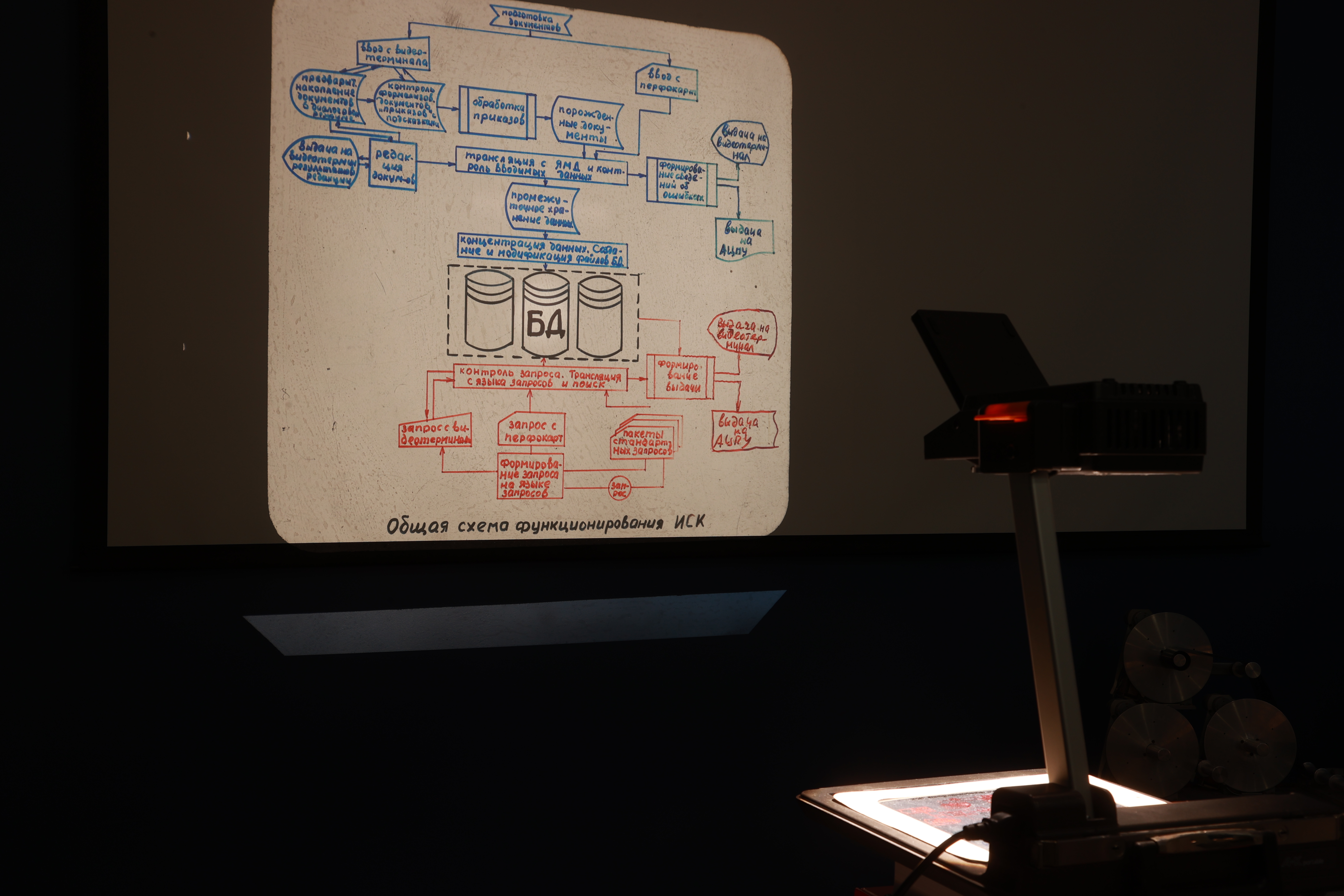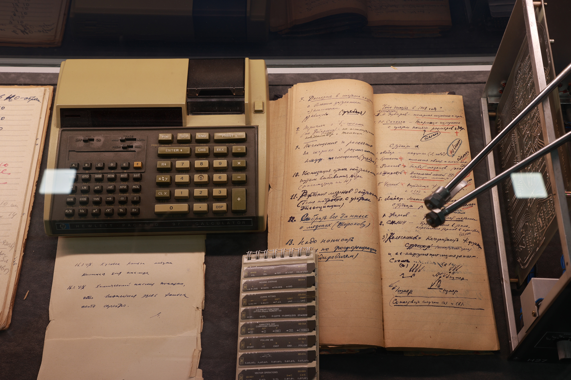 Many items presented here are unique, for example, silver foil used by M. G. Meshcheryakov at Radium Institute in Leningrad, an arithmometer of the Phenix series that also belonged to Meshcheryakov. A calculator and notebook of the Hewlett-Packard company that belonged to the desk officer of G. N. Flerov. A sample of the Dubna “folk art craft” – reverse carving on thick-layer plexiglass of 1994: it was a gift from the LHE team to A. N. Sissakian. And here are two albums of drawings by B. S. Neganov extracted in 2018 from under the snow! There are also the manuscripts of M. G. Meshcheryakov and B. Pontecorvo, including the manuscripts made on the transperencies and intended for display on the overhead. There is a large-format JINR departmental envelope with the name of the Institute in the languages of all the Member States of the late 1950s and early 1960s (including Albanian and Chinese). Anniversary envelopes dedicated to JINR with the cancellation of the first day. Next — laboratory logs. The new employee of the Hydroengineering Laboratory Bruno Pontecorvo filled them in a bizarre mixture of English and Italian (then, of course, Russian was added to them)… In the laboratory journal of S. M. Korenchenko, Bruno Pontecorvo appears as an anonymous ‘professor ______’. The laboratory journal of E. P. Shabalin reflects the moment when the pulsed reactor IBR-1 started operating. There is also a neutron tape measure made in Obninsk in a single copy on the instructions of D. I. Blokhintsev. Representing a mechanical random number generator, it was used in the design of the IBR-1 reactor. The exhibition has a section of the French DIDAC spectrometer. Tsvetan Vylov, a JINR Vice-Director, compiled an atlas of radiation spectra of radioactive nuclides. And many, many other items.