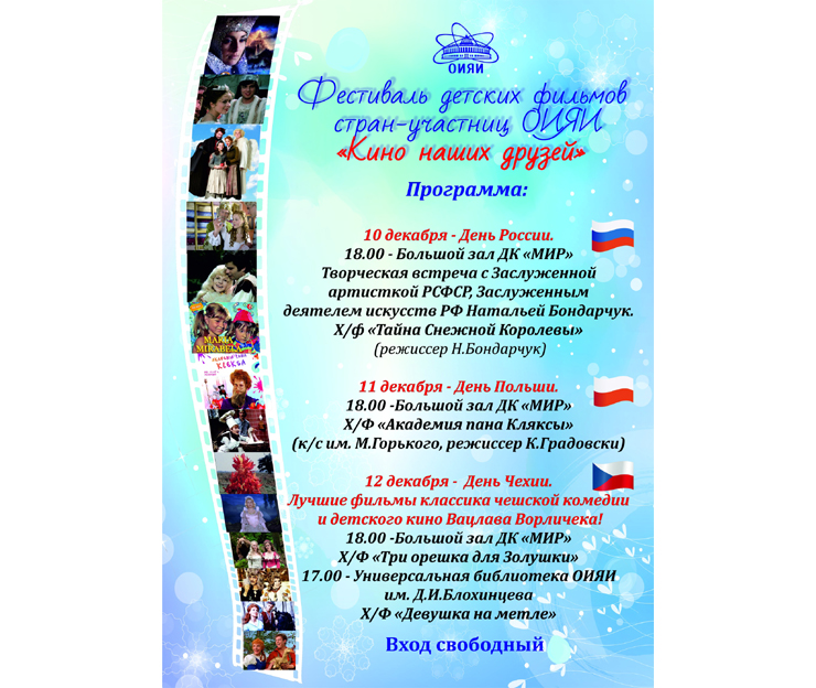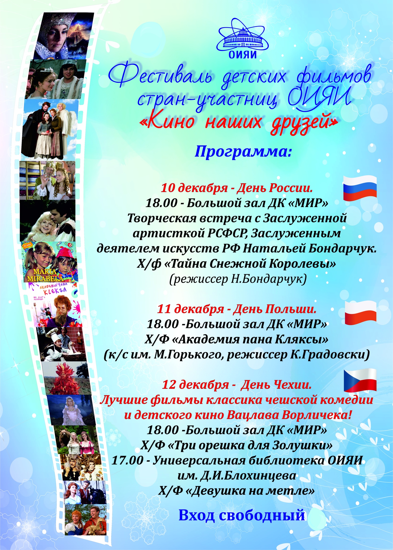 С 10 по 12 декабря 2019 года Дом культуры «Мир» ОИЯИ приглашает на Фестиваль детских фильмов стран-участниц ОИЯИ «Кино наших друзей».