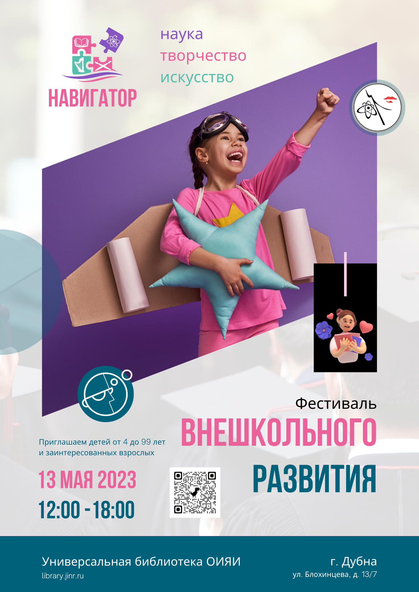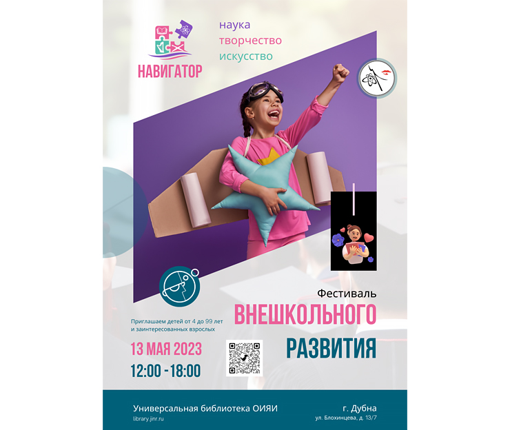 им. Д. И. Блохинцева пройдет фестиваль внешкольного развития и обучения «Навигатор» для взрослых и детей от 4 лет, организованный совместно Женским комитетом ОИЯИ и Блохинкой. Цель мероприятия — рассказать родителям о возможностях дополнительного обучения и развития детей в Дубне.