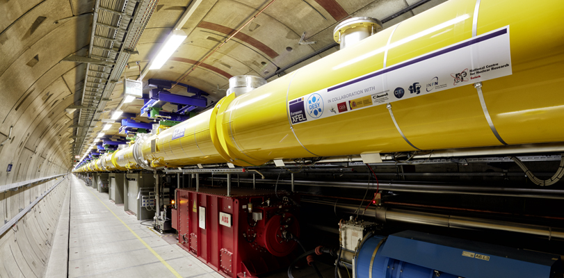 View into the 2.1-kilometre long accelerator tunnel of European XFEL with the yellow superconducting accelerator modules hanging from the ceiling. Photo: European XFEL / Heiner Müller-Elsner