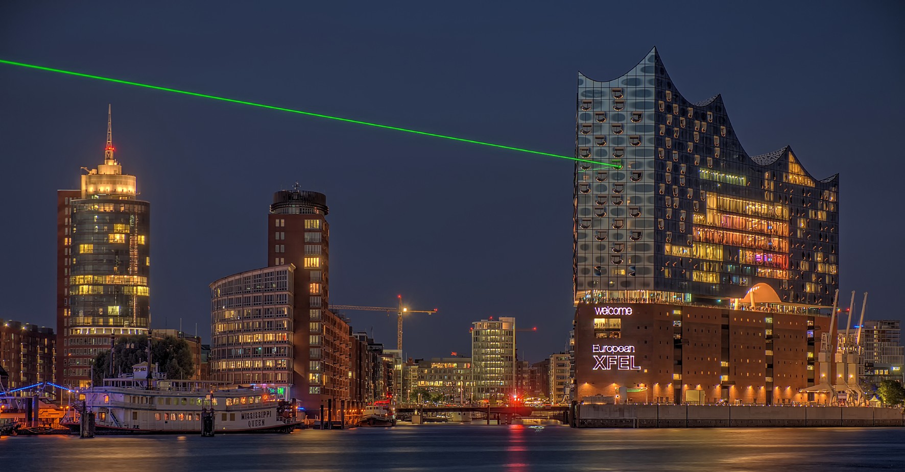 Hamburg says ‘welcome’ to European XFEL! The light and laser installation will run every evening until 3 September (Credit: Michael Schmidt)