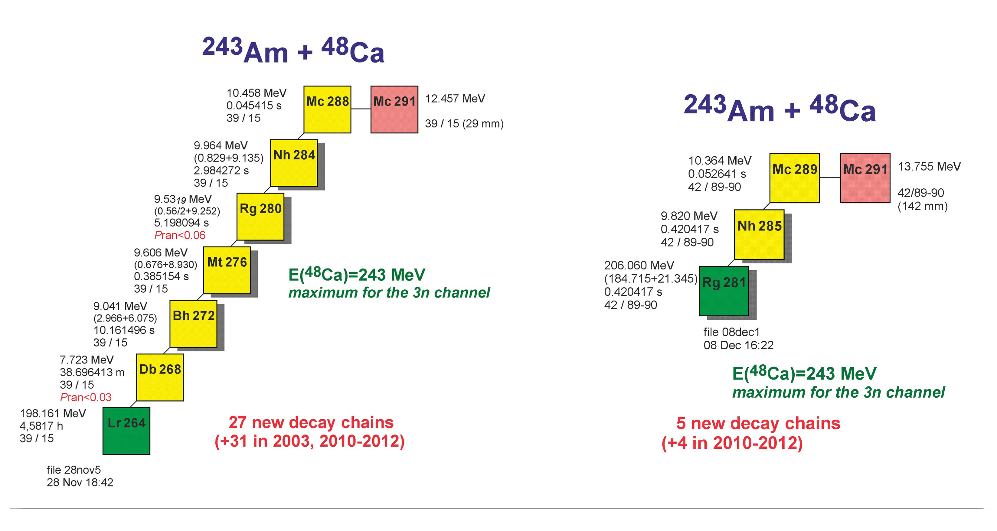 The energy of 48Ca projectiles in the first run amounted to 243 MeV, which was consistent with the maximum of the 3n channel cross-section for the reaction. During the three-week run, 27 decay chains of 288Mc and five decay chains of 289Mc were detected. This nearly doubled the statistics on these isotopes gathered at the U-400 accelerator complex over the period 2003–2012.