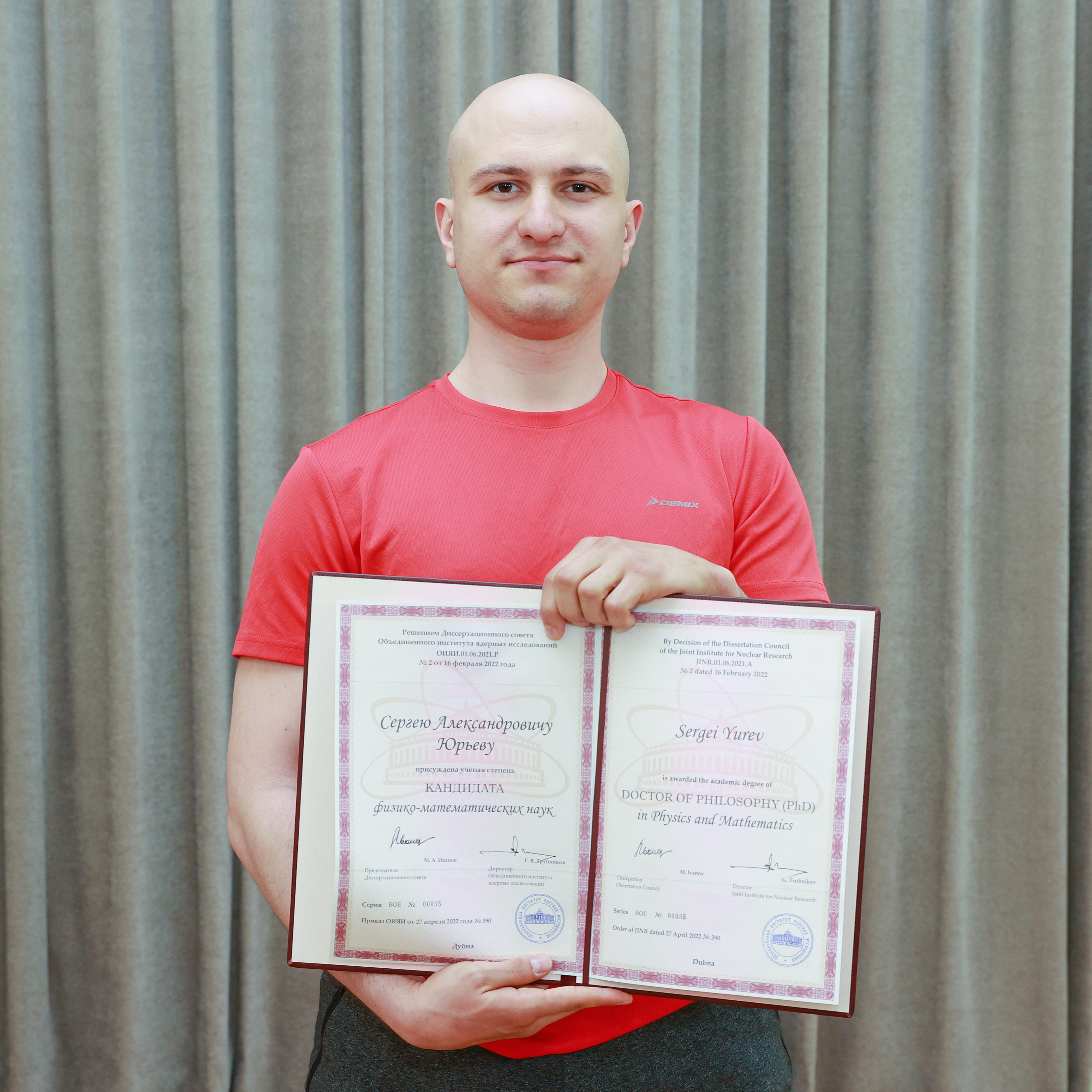 This time, Alan Dzhioev, Aleksi Gongadze, Maxim Eremenko, Uladzimir Kruchonak, and Sergey Yuriev received diplomas. The awarding of diplomas took place with the participation of JINR Scientific Leader and Chairman of the Qualification Commission of JINR Victor Matveev, Scientific Secretary of the Qualification Commission Oleg Belov, scientific secretaries of the Dissertation Councils and their assistants.
