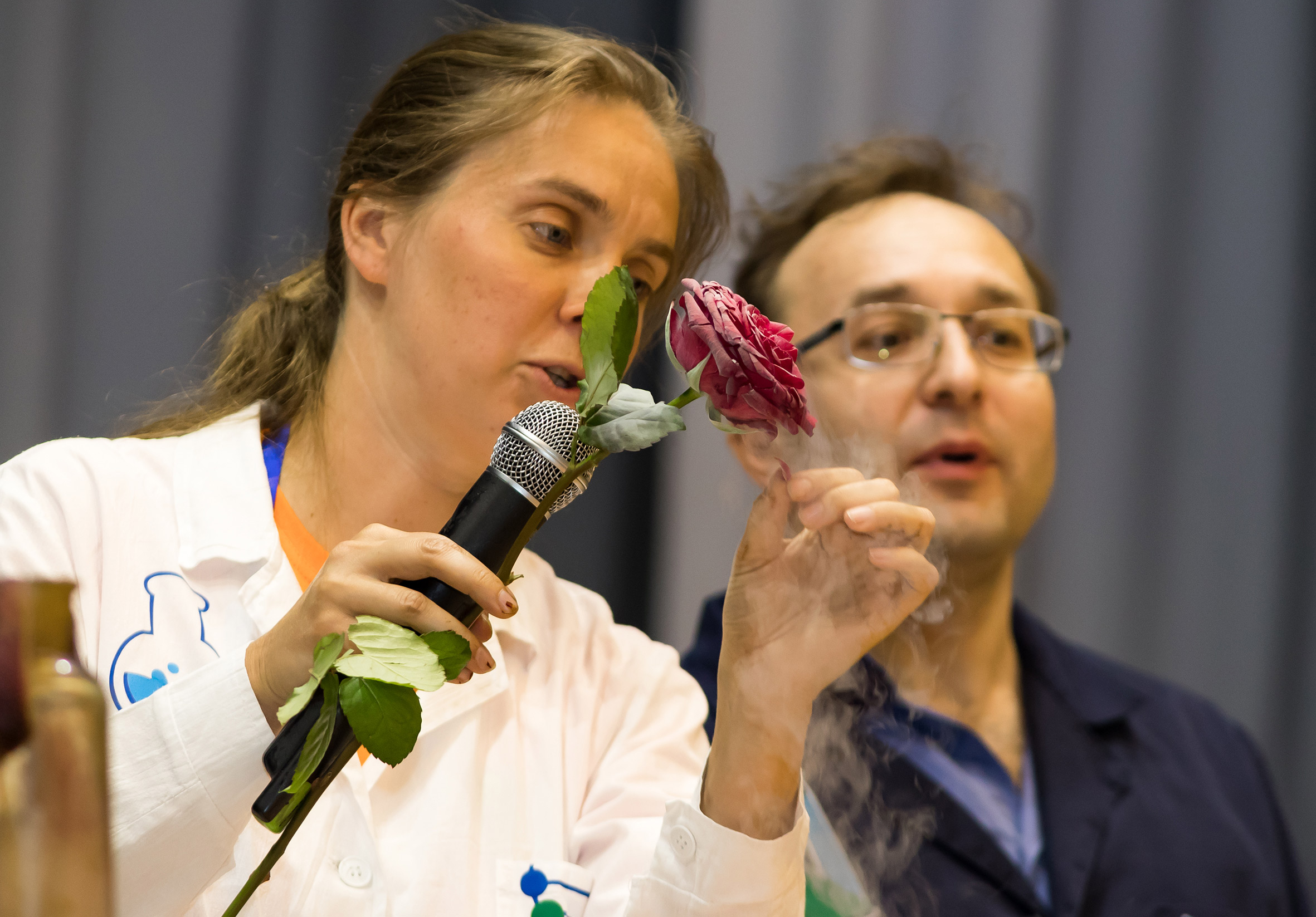 Год от года все больше зрителей привлекают зрелищные химические и физические опыты, проводимые Д. К. Дрябловым (ЛФВЭ) и А. Е. Злотниковой (Музей истории науки и техники ОИЯИ). В этом году программа их шоу стала еще обширнее: от простых, но эффектных обесцвечивания йода с помощью аскорбиновой кислоты и создания киношной «крови», – до вызывающих восторг наполненного большого зала Дома культуры гигантской «зубной пасты» для слона, «горящей» руки и азотного «взрыва». Праздник прошел. Вы не были на нем? Обязательно приходите в следующем году.