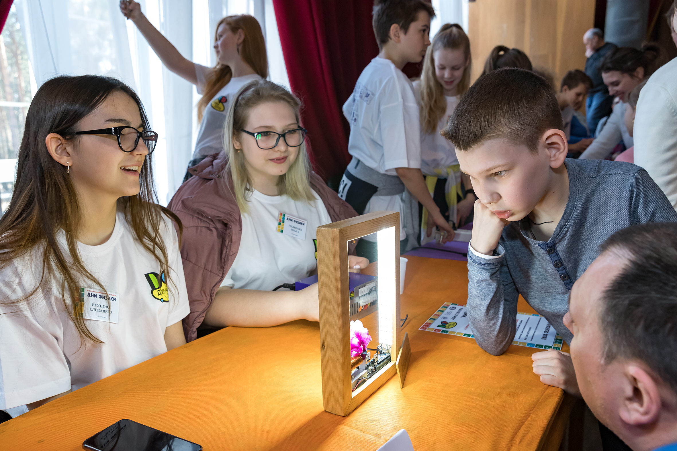 Дни физики – настоящий праздник погружения в удивительный мир физики и химии. Дни организованы так, что дети-старшеклассники демонстрируют и объясняют посетителям различные физические закономерности на ими же сконструированном оборудовании. Эти эксперименты, всегда яркие, а иногда неожиданные и заставляющие задуматься, неизменно привлекают большое количество зрителей – от дошкольного до пенсионного возраста. Привлекательны они и для участников, поскольку, судя по их отзывам, нигде, кроме Дубны, в таком формате эти мероприятия не проводятся. Кроме того, иногородние участники в первый день смогли познакомиться с Дубной, пройдя увлекательный квест по городу и побывав в Музее истории науки и техники ОИЯИ, и поиграли в интеллектуальную игру «Что? Где? Когда?». А в следующие два дня Дом культуры «Мир» превратился в одну большую лабораторию: в субботу в малом зале демонстрировались опыты, в большом и выставочном залах проходил квест «Периодический закон», в воскресенье состоялись традиционные математический праздник и мастер-классы, а День космонавтики был отмечен запуском ракет на Молодежной поляне.