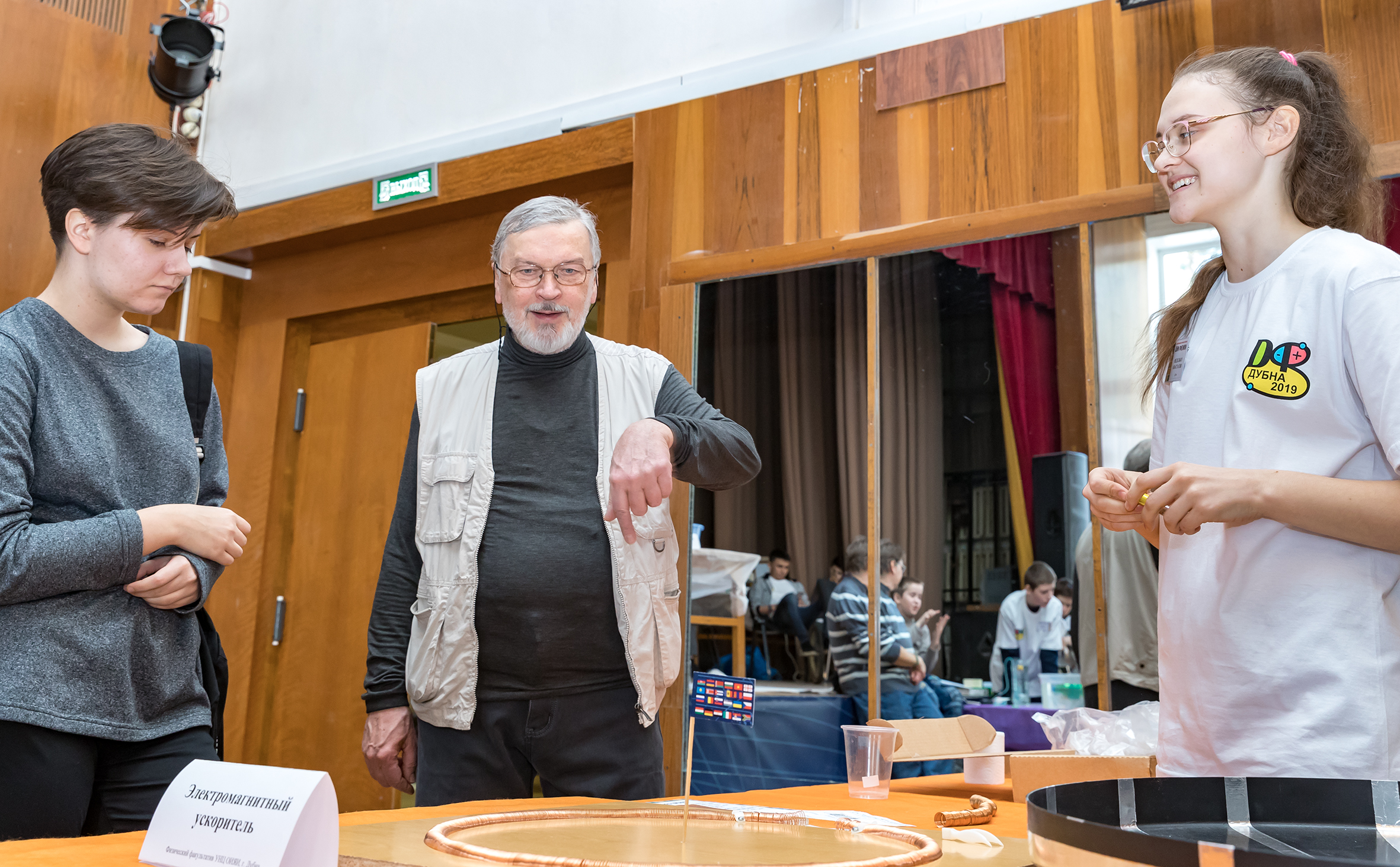 Председатель оргкомитета фестиваля М. В. Жабицкий (ОИЯИ): Так много приезжих команд у нас не было никогда, в этом году к нам приехали шесть команд: неоднократно участвовавшие московская гимназия № 1514, физмат лицей из Санкт-Петербурга, впервые приехали ребята из Волгограда, Глазова и подмосковной Истры, не первый раз приезжает команда из Брянска. Из дубненских команд всегда активно участвуют ребята из физмат факультативов УНЦ (И. А. Ломаченков) и И. Г. Осипенковой (школа № 6), из лицея «Дубна». Все эксперименты, представленные ребятами, непростые. Мы всегда приветствуем опыты, связанные по тематике с физикой частиц или физикой ядра. В этом году участники команды физмат факультатива под руководством И. А. Ломаченкова подготовили много новых экспериментов, они сделали «ускоритель» – шарик, который ускоряется электромагнитным полем в картонном ограждении.