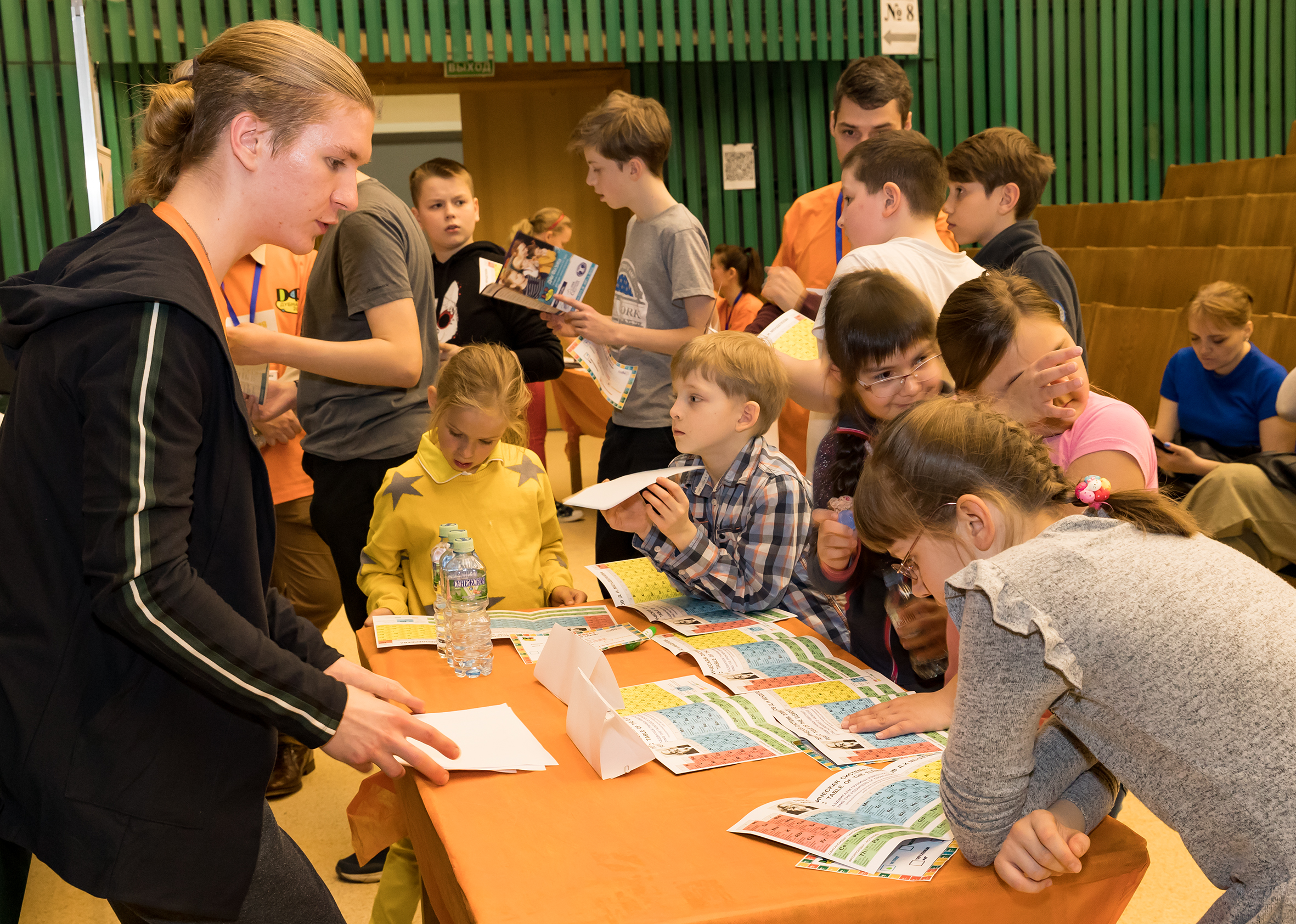 Ю. С. Северюхин (ЛРБ): Мы с коллегами участвуем в квесте, наша станция называется «Биология». Мы рассказываем детям о том, какие химические вещества есть в нашем организме, как они участвуют в разных биологических процессах, то есть через биологическую призму представляем им таблицу Менделеева. Дети также собирали паззл, с изображением скелета, а мы им рассказывали о кальции в костях. А под микроскопом они увидели красные кровяные тельца, такие бутафорские эритроциты, содержащие гемоглобин, важный белок, в состав которого входит железо. Мы рассказывали про химические элементы, которые находятся в организме в максимальном количестве: углерод, кислород, азот, водород, чтобы дети понимали, что химия не только вокруг, но и внутри нас.