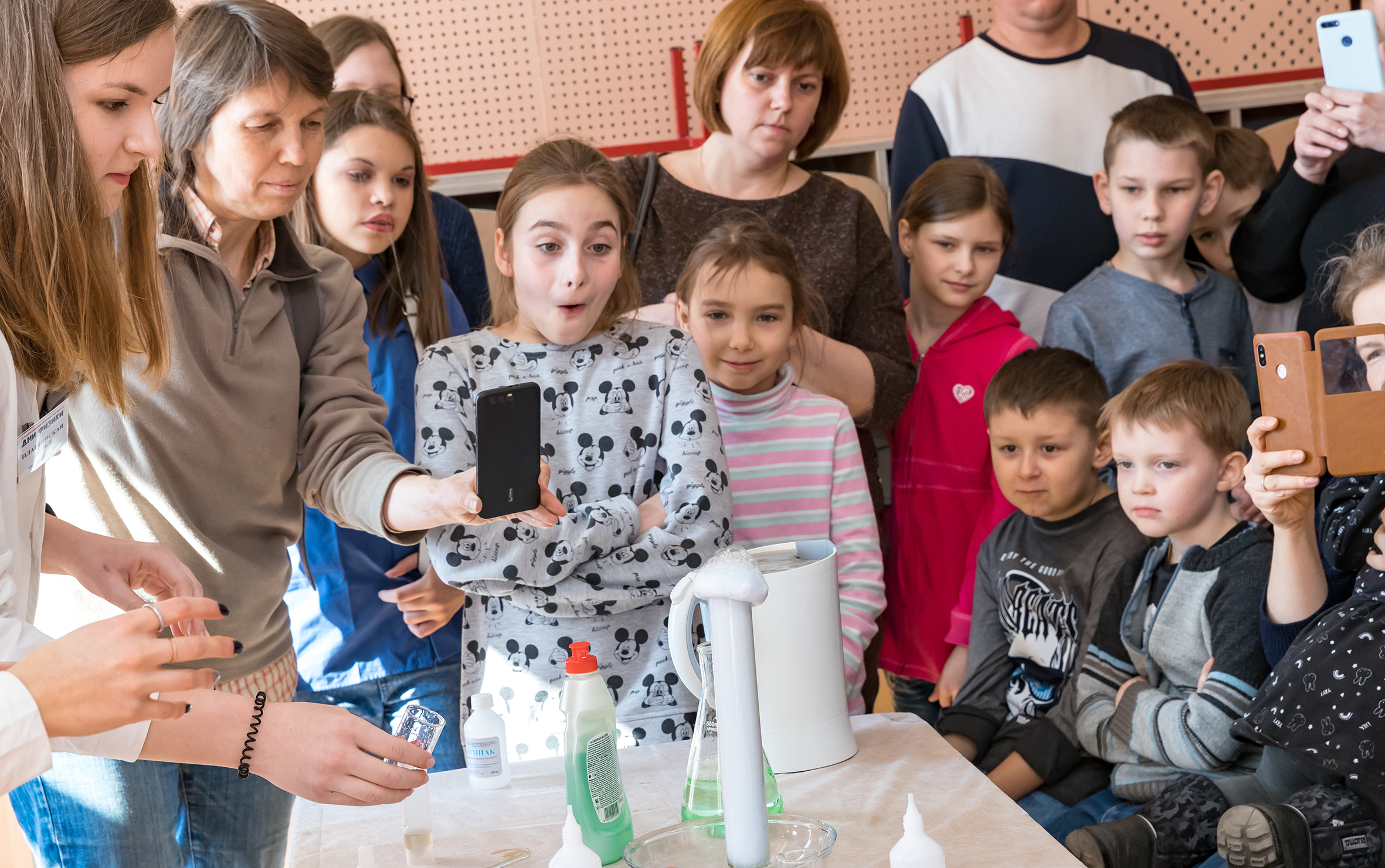 Восторженную реакцию малышей вызвали химические опыты «Пенная вечеринка» от студентов МФТИ. Дарья Плащинская: Я учусь на первом курсе биофизического факультета. Мы готовились к этим опытам, некоторые реактивы сами нашли, некоторые дал наш лаборант, который даже обрадовался, что мы сами немножко наукой позанимаемся и детям что-то продемонстрируем. Мы репетировали, кажется, получилось.