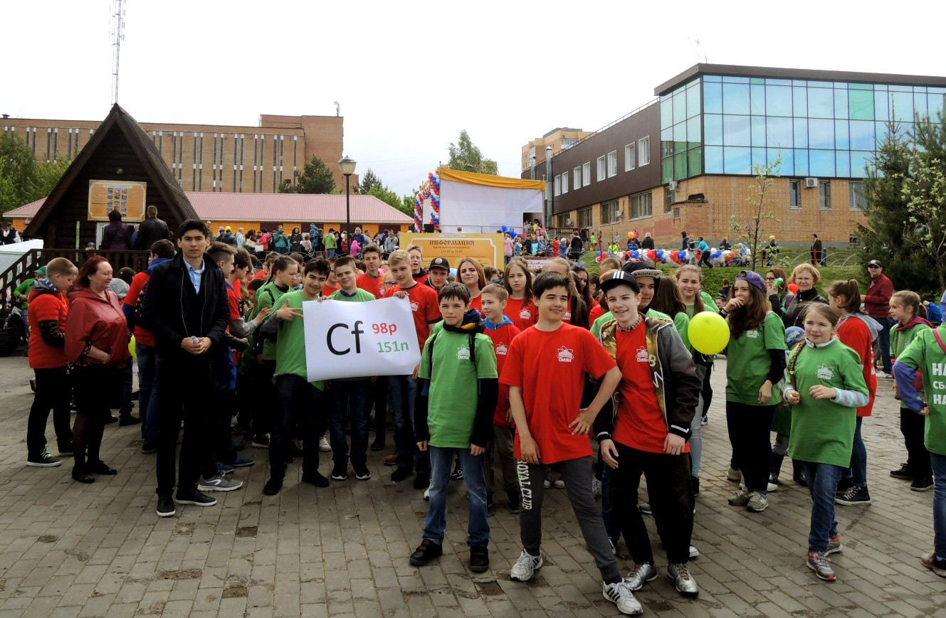 Первого июня, в Международный день защиты детей, когда в Дубне состоялась благотворительная акция Первого канала, одним из оригинальных и зрелищных событий стал детский флешмоб. Две команды – «ядро кальция» и «ядро калифорния» – воспроизводили ядерную реакцию: на мишень из калифорния «налетали» ядра кальция, в результате образовывалось «ядро оганесона», элемента, впервые синтезированного в Лаборатории ядерных реакций имени Г. Н. Флерова.