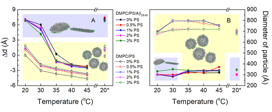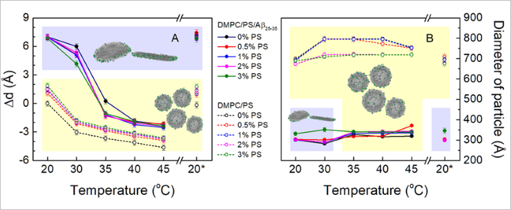 Relative change in membrane thickness Δd (A) and diameter of bicelle-like structures and single-layer vesicles (B) obtained as a result of approximation of small angle neutron scattering data