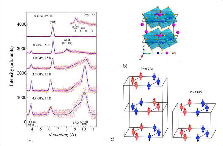 Fig. 2. (a) Neutron diffraction patterns of FePS3 obtained at various pressures and temperatures and profiles calculated by the Rietveld method. (b) Monoclinic structure of FePS3 of C2/m symmetry. (c) Magnetic structure of FePS3 at normal and high pressures.