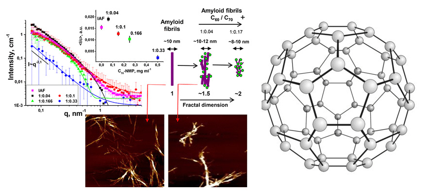 “Our study pursued two goals: we aimed to evaluate the anti-amyloid activity of aqueous solutions of C60 and C70 fullerenes dispersed in N-methylpyrrolidone (NMP) and to analyze the mechanism of amyloid disassembly. These are important issues for further successful use of fullerenes and other nanoparticles in the treatment of diseases associated with the formation of amyloid fibrils,” explained Mikhail V. Avdeev, a researcher from the Frank Laboratory of Neutron Physics, JINR. For this purpose, the scientists used a combination of several biophysical and biochemical techniques, including small-angle neutron scattering, as well as previous results of joint investigations performed together with the research teams of Peter Kopčanský from the Institute of Experimental Physics of the Slovak Academy of Sciences (IEP SAS) and Leonid A. Bulavin from the Taras Shevchenko National University of Kyiv.