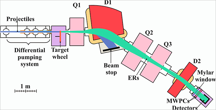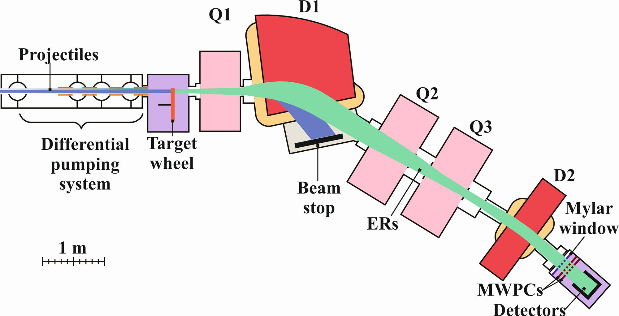 Сепаратор DGFRS-2 имеет ионно-оптическую схему QvDhQhQvD. Квадруполь Qv фокусирует вылетевшие из мишени ионы в вертикальном направлении так, чтобы большая часть продуктов реакции полного слияния (ERs) проходила через зазор дипольного магнита Dh. Этот магнит отклоняет ионы на 31.5° и фокусирует их в горизонтальном направлении. Диполь отделяет ERs от частиц пучка и подавляет большую часть других фоновых частиц (таких, как рассеянные ионы пучка и мишени, продукты неполного слияния и т. д.). Квадруполи Qh и Qv фокусируют ERs на детектор, расположенный в фокальной плоскости DGFRS-2, в горизонтальном и вертикальном направлениях. Диполь D с углом отклонения 10° дополнительно подавляет фон от заряженных частиц – альфа-частиц, протонов и т.д., образующихся в реакциях ионов пучка с газом и внутренними стенками DGFRS-2.