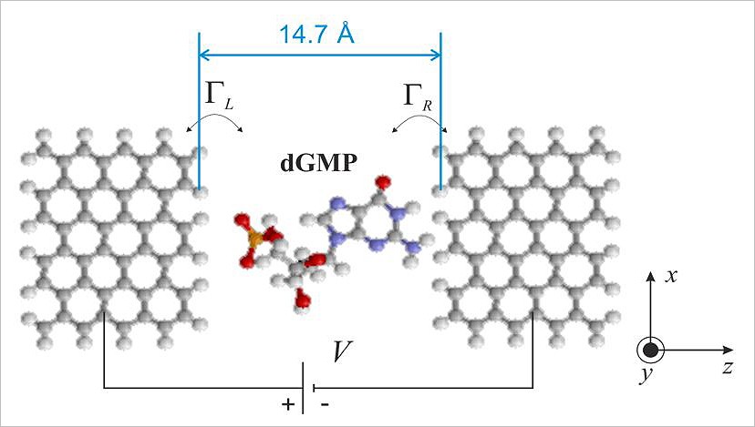 (2) The mechanism of DNA decoding using graphene electrodes separated by a nanogap was investigated [7, 10]. The very principle of the device and the decryption mechanism were proposed earlier by other authors. The main idea here is to use the value of the tunneling current in the graphene/nucleotide/graphene system as a factor for determining the type of nucleotide. Our contribution to the study of this mechanism lies in the fact that we took into account such phenomena as (a) the possibility of random orientation and localization of the nucleotide during its dragging through the nanogap, and (b) the effect of the Coulomb blockade on the tunneling current in this system. As a result of the study, it turned out that both factors noticeably modify the tunneling current in the system, which makes the possibility of decoding nucleotides only by this parameter fundamentally unrealizable in practice. We proposed a way out of this situation: it turned out that if, when carrying out a statistical analysis, not only the average value of the tunneling current, but also its mean-square deviation is used as a factor for nucleotide identification, then the decoding process becomes possible.
