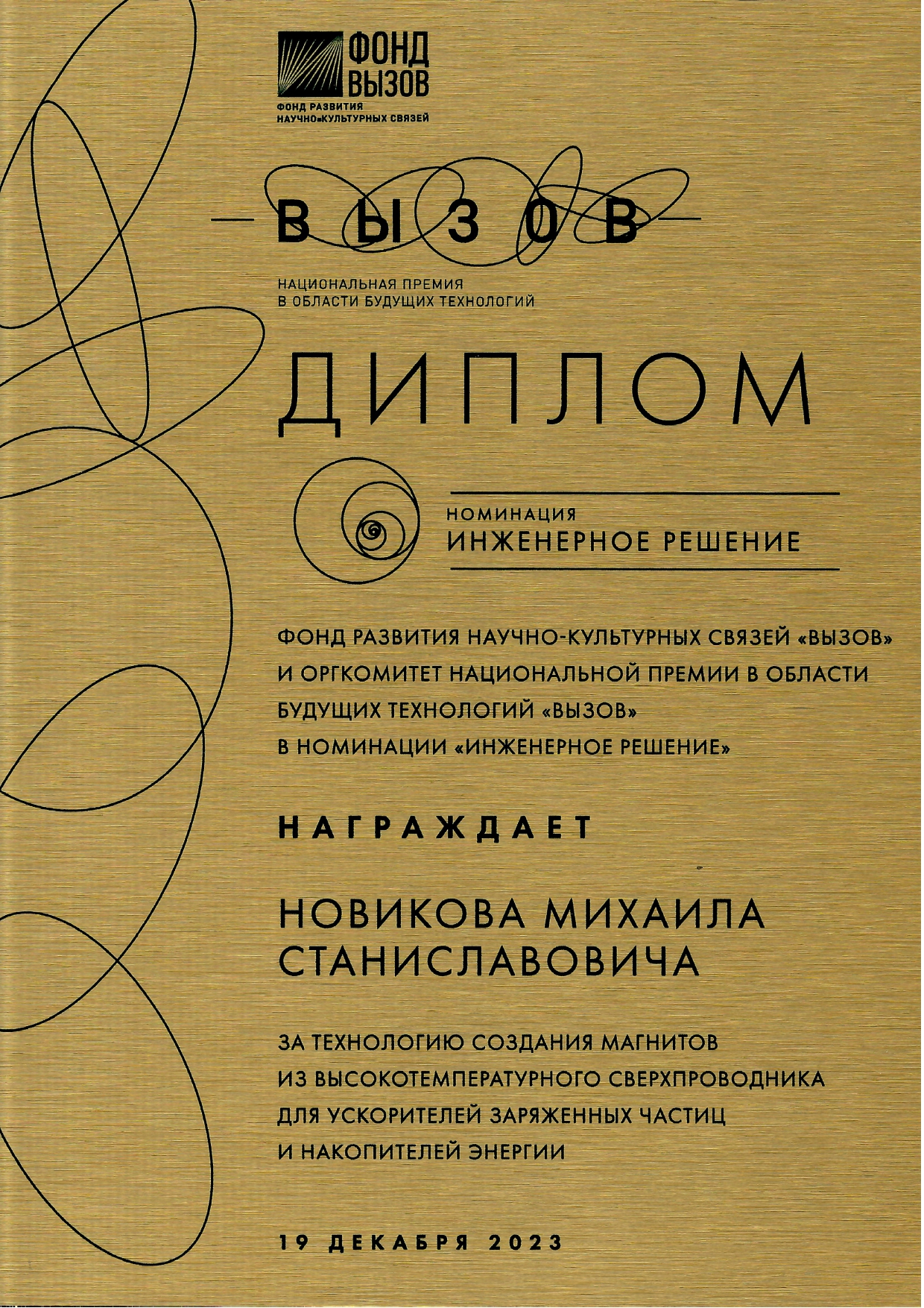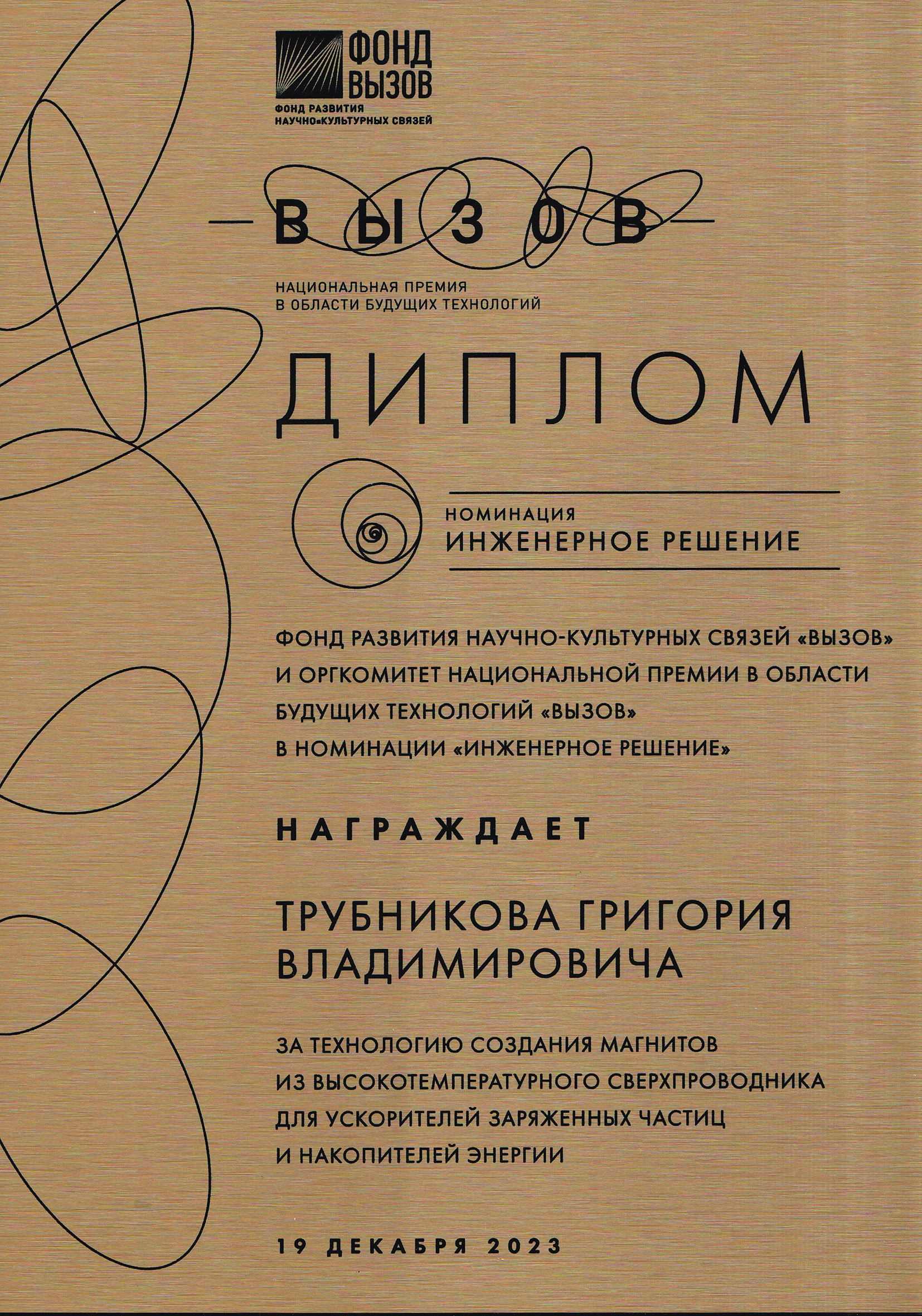 On 19 December, the first award ceremony of the Vyzov National Prize for future technologies took place in Moscow. Deputy Director of the Laboratory of High Energy Physics for Scientific Work, Candidate of Technical Sciences Hamlet Khodzhibagiyan won the Prize in the Engineering Solution category. The scientists received the Prize for the development of magnetic systems based on high-temperature superconductors for charged particle accelerators and ultrahigh power energy storage devices. The co-authors of the work are Director of the Joint Institute for Nuclear Research, Academician of the Russian Academy of Sciences Grigory Trubnikov and Head of the VBLHEP High-Temperature Superconducting Magnets Sector, Candidate of Technical Sciences Mikhail Novikov.