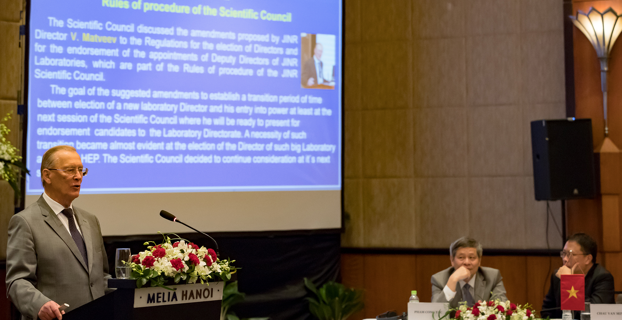 В своем выступлении с отчетом дирекции ОИЯИ академик В. А. Матвеев отметил, что «выбор Ханоя в качестве места заседания КПП должен содействовать укреплению и развитию сотрудничества ОИЯИ с научными организациями и университетами Вьетнама – страны, которая принадлежит к числу государств, вошедших в состав нашей международной организации в первый год ее создания». Финансовый отчет дирекции и проект бюджета ОИЯИ на 2020 год представил заместитель руководителя финансово-экономического управления ОИЯИ М. П. Васильев. По просьбе редакции Еженедельника ОИЯИ итоги сессии комментирует директор Объединенного института ядерных исследований академик Виктор Анатольевич Матвеев.