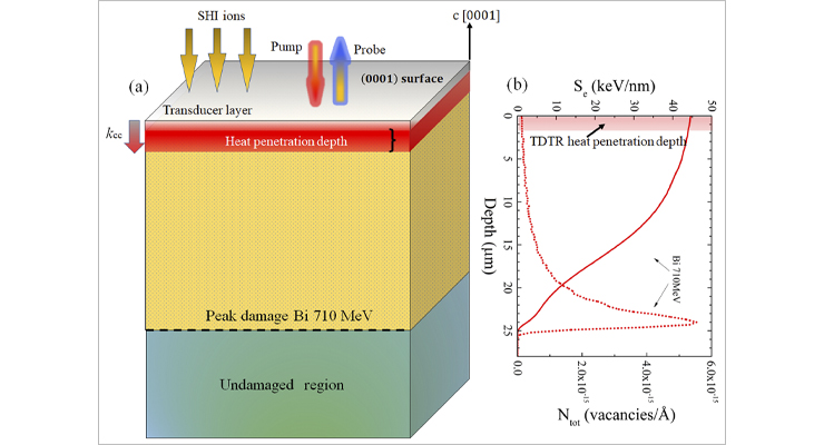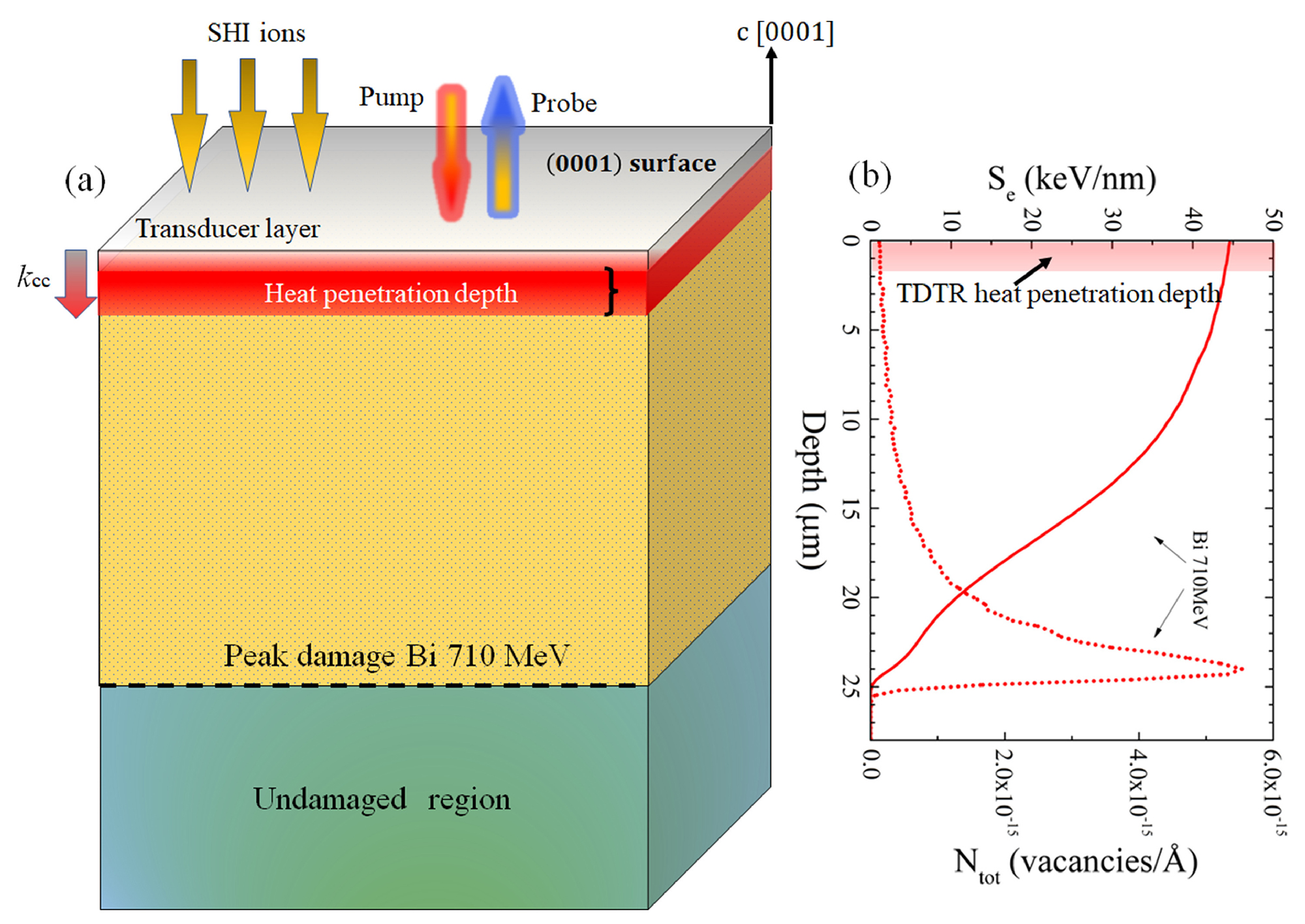 (a) Schematic view of the SHI irradiated ZnO structure with deposited Al heat transducing layer for thermal measurement. (b) Ionisation energy loss (solid line) and vacancy production profile (dotted lines) in ZnO as a function of projected depth for 710 MeV Bi irradiation.