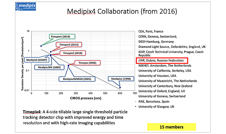 In 2016, the new Medipix4 Collaboration was founded. It comprises 15 scientific centres across the world, including the JINR group. As a result, the position of the group has qualitatively changed: now the scientific JINR group consists of developers and designers of a new-generation pixel chip.
