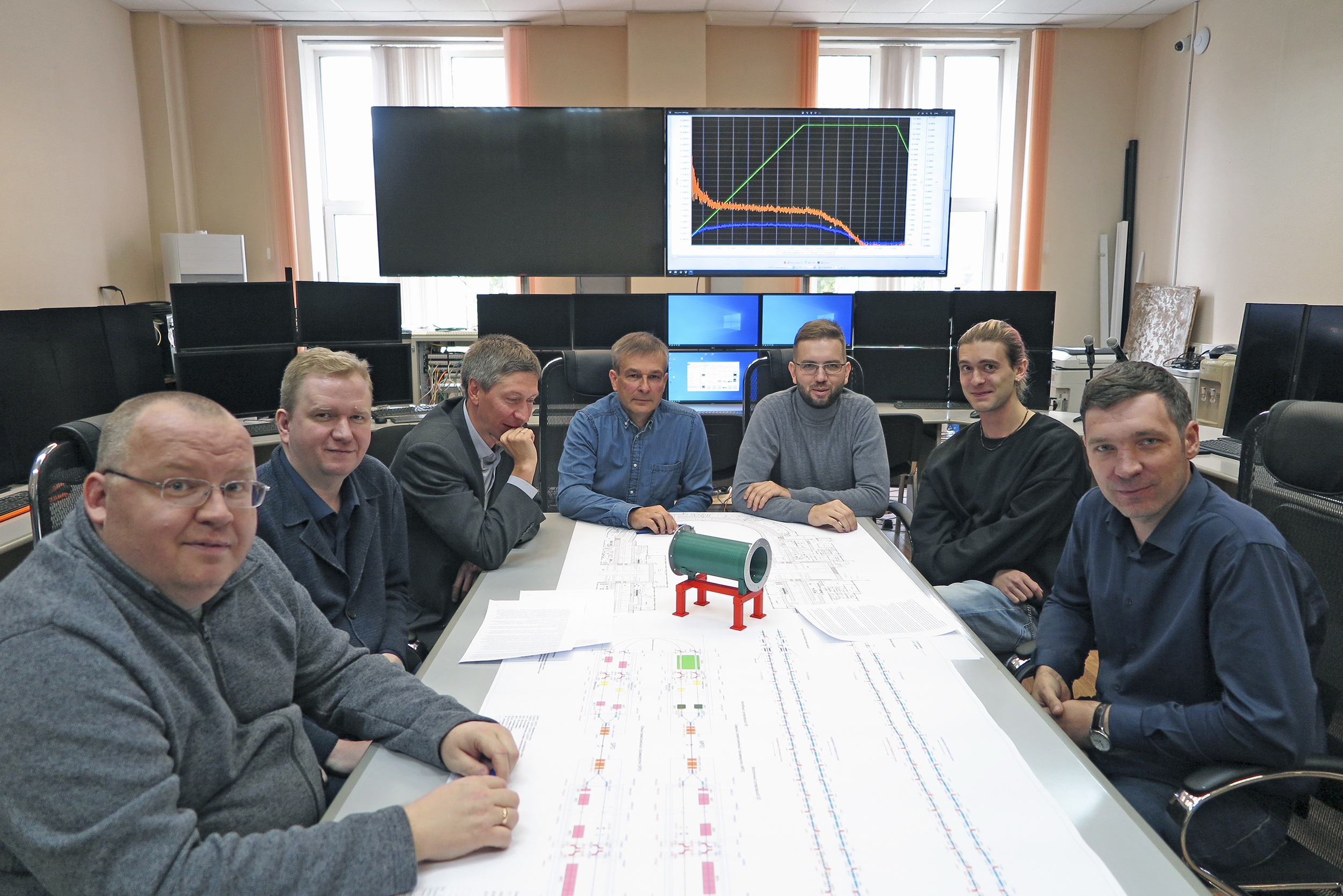 A team of scientists engaged in beam dynamics calculations at the NICA control room (from left to right): A.V. Filippov, A.V. Tuzikov, S.A. Kostromin, O.S. Kozlov, M.M. Shandov, S.A. Melnikov, V.L. Smirnov
