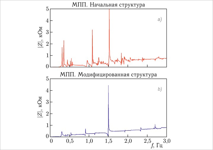 Frequency dependence of the longitudinal coupling impedance for the basic beam position sensor configuration(a) and the optimised structure (b)