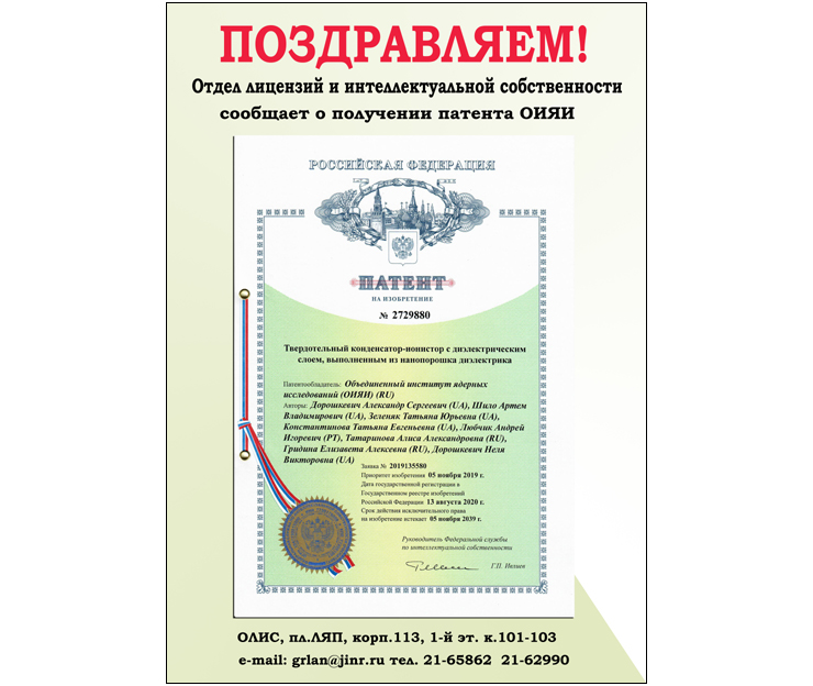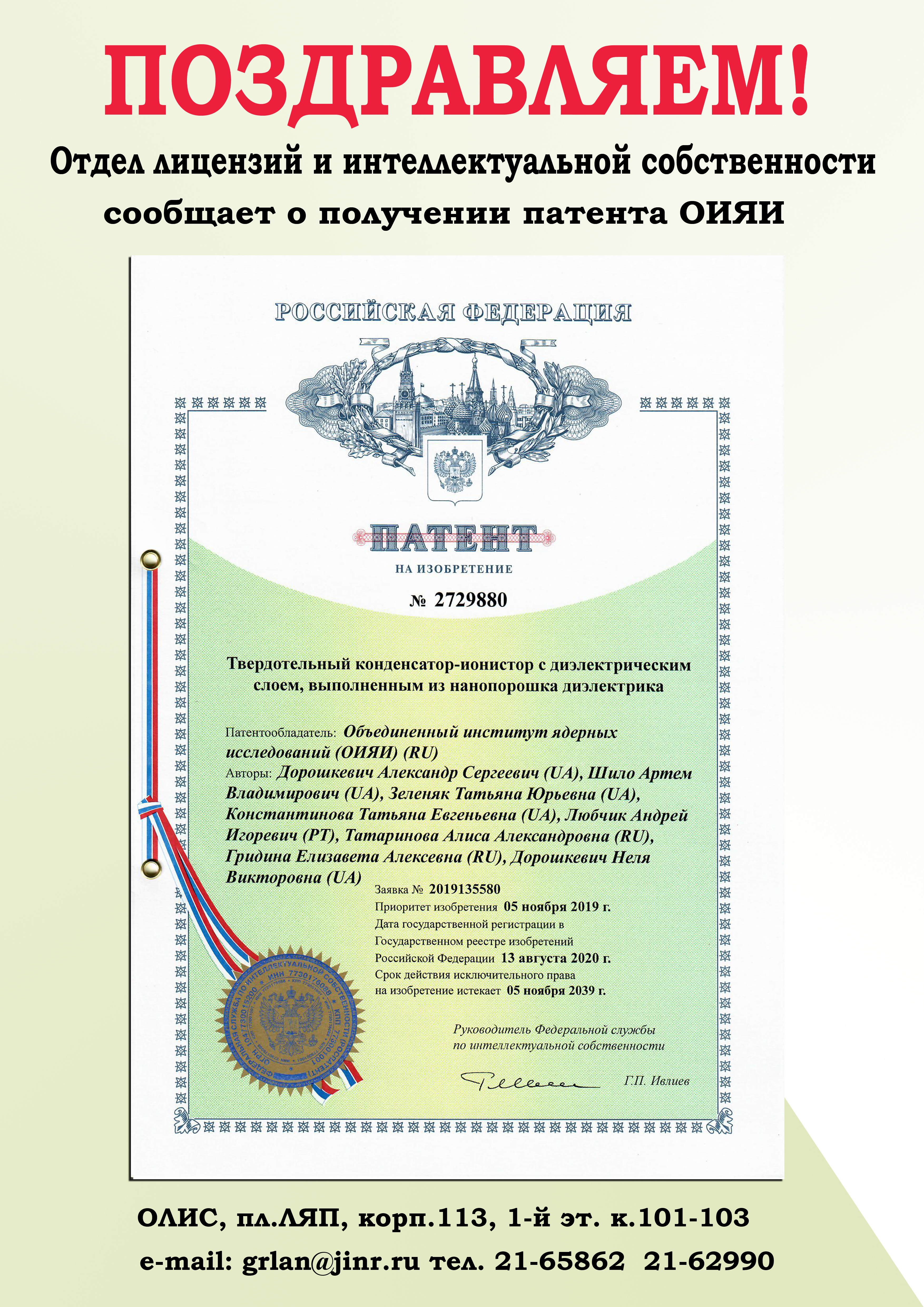 The Licensing and Intellectual Property Department of JINR announces that on 13 August 2020, the Joint Institute for Nuclear Research received a patent for the invention “Solid-state capacitor-ionistor with a dielectric layer made of dielectric”. The authors of the work are Doroshkevich Alexander Sergeevich, Shilo Artem Vladimirovich, Zelenyak Tatyana Yurevna, Konstantinova Tatyana Evgenevna, Lyubchik Andrey Igorevich, Tatarinova Alisa Alexandrovna, Gridina Elizaveta Aleksevna, Doroshkevich Nelya Viktorovna.