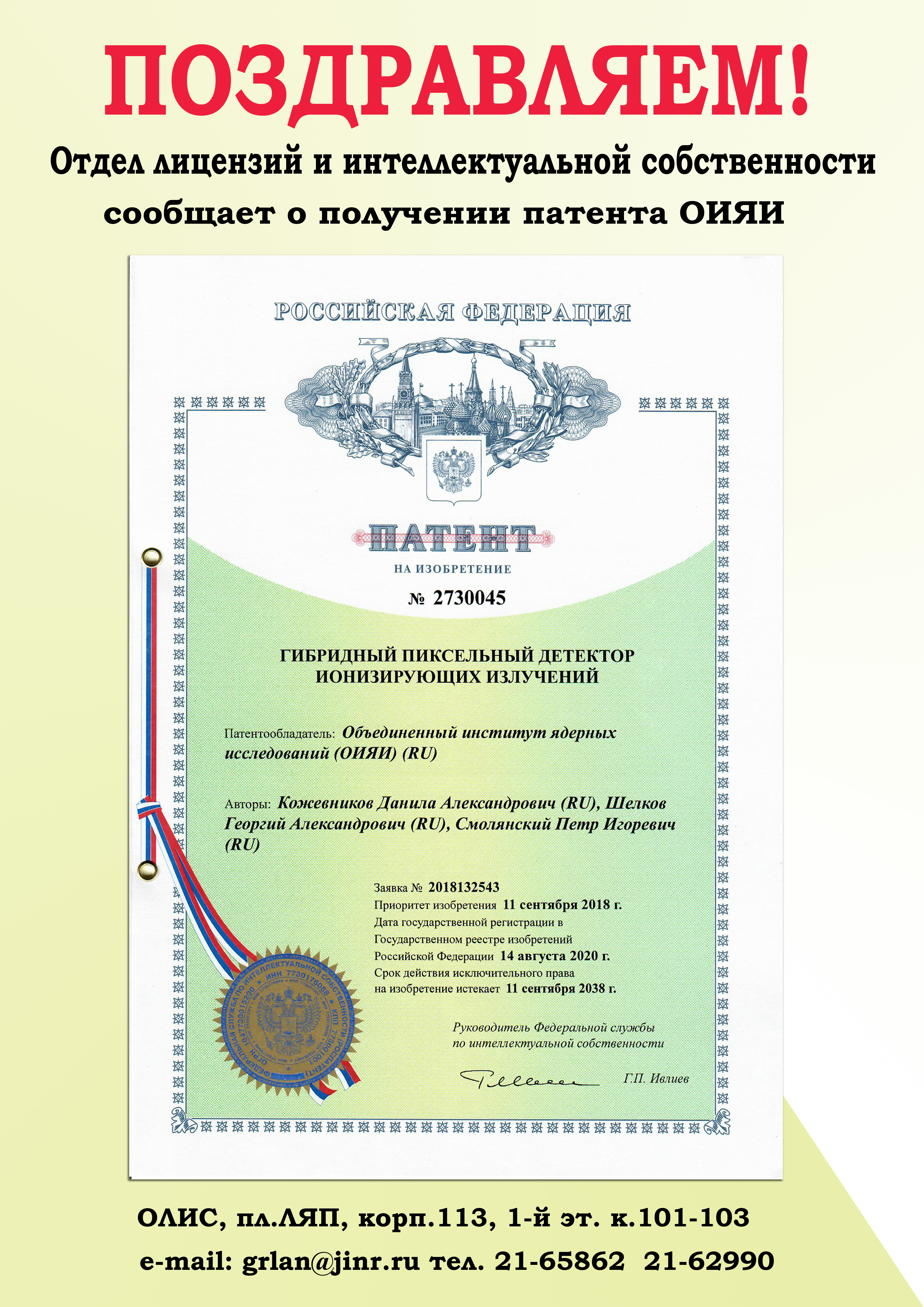The Licensing and Intellectual Property Department of JINR announces that on 14 August 2020, the Joint Institute for Nuclear Research received a patent for the invention “Hybrid pixel detector of ionizing radiations”. The authors of the work are Kozhevnikov Danila Alexandrovich, Shelkov Georgy Alexandrovich, Smolyansky Petr Igorevich.