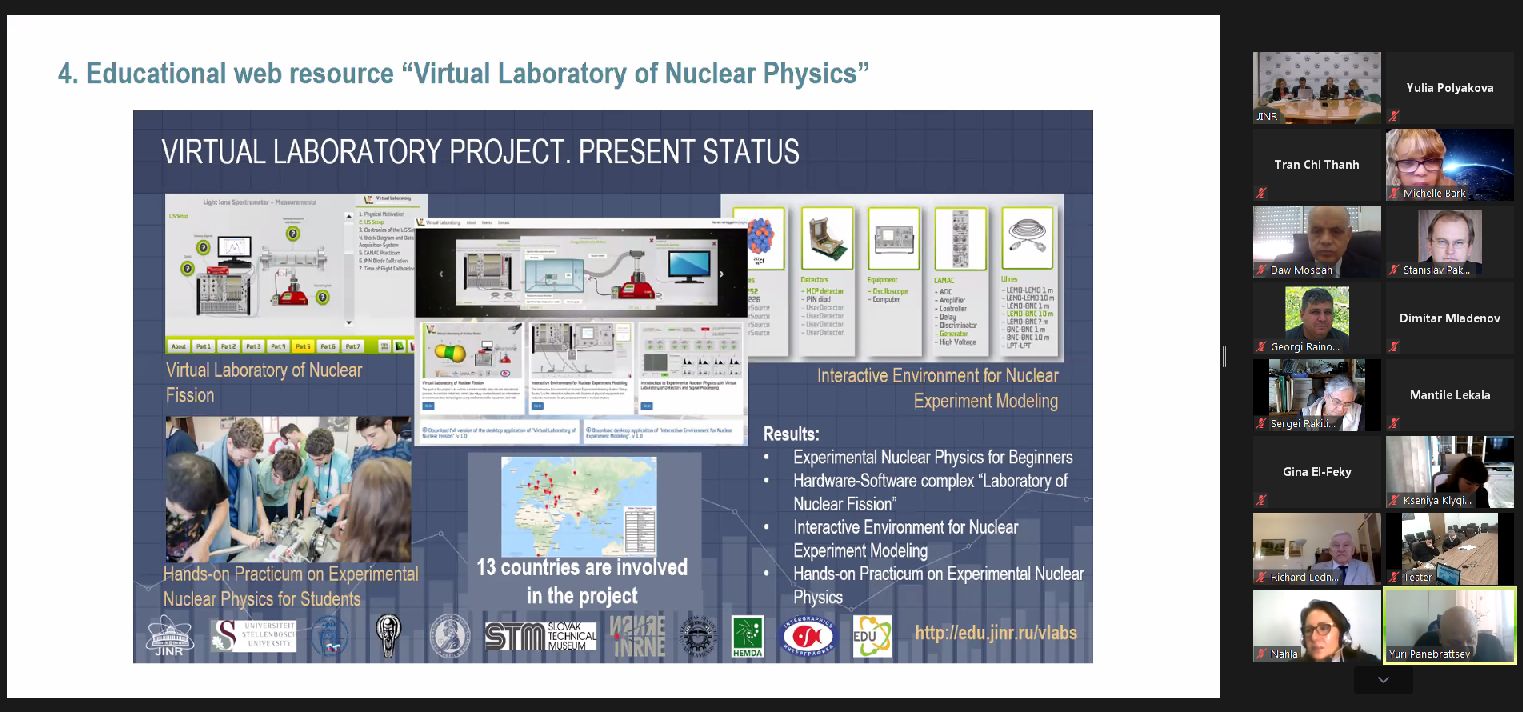 На совещании выступила ведущий специалист Отдела разработки и создания образовательных программ УНЦ Ксения Клыгина, рассказавшая о статусе образовательного проекта ОИЯИ “Виртуальная лаборатория” и входящих в него вводных курсах по тематике ядерной физики, виртуальных и инженерных практикумах для студентов. Как сообщила Ксения Клыгина, в будущем планируется открыть новое направление Remote Labs, которое позволит студентам удаленно осваивать работу на двух реальных физических установках: гамма-спектрометр и сцинтилляторный стробоскоп.