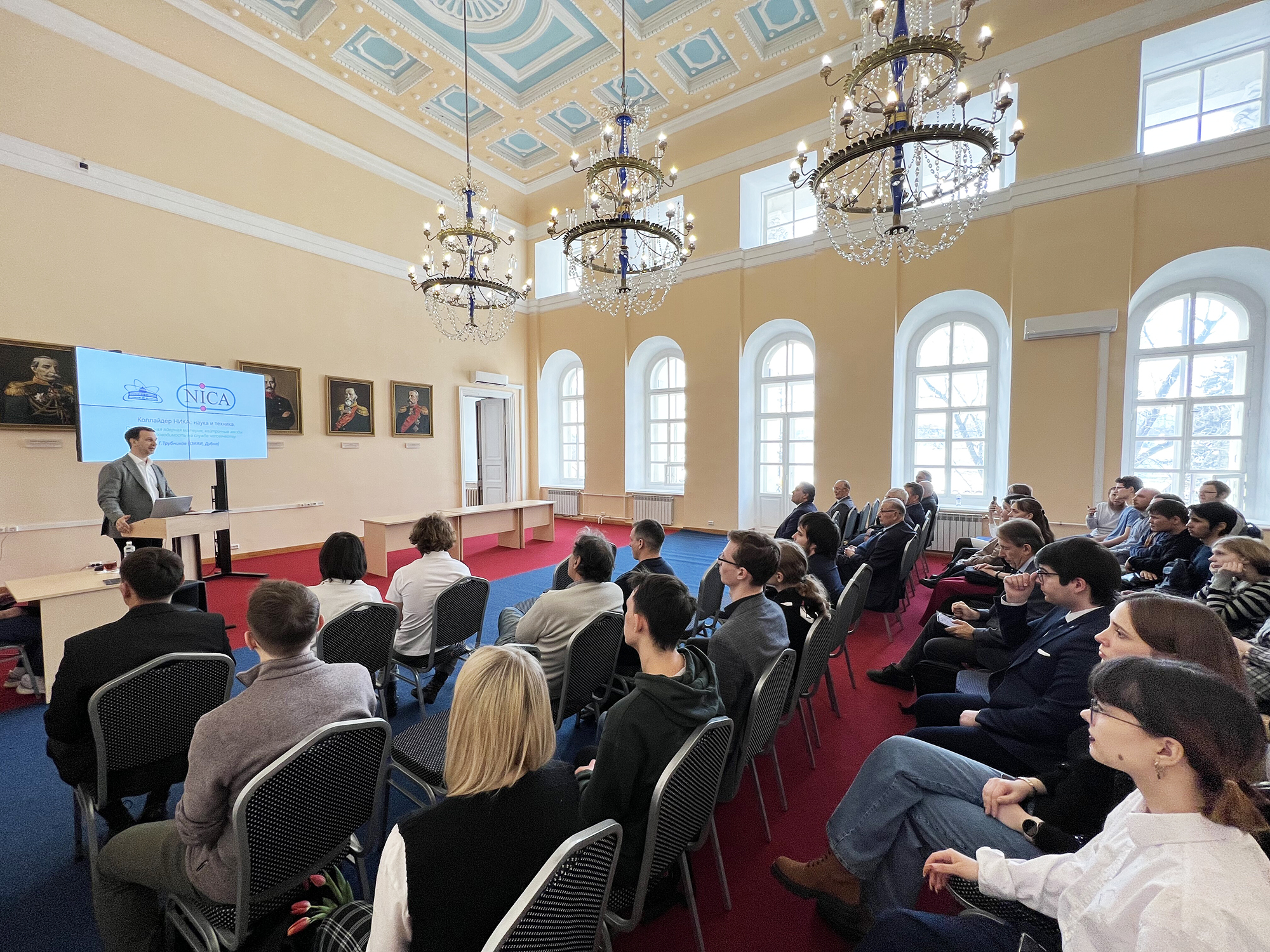 В рамках программы мероприятий в Иркутске директор ОИЯИ Григорий Трубников прочел лекцию в Губернаторском зале Белого дома ИГУ, собравшую полный зал слушателей. Академик Трубников рассказал о мегасайенс-проекте NICA и его научных задачах.