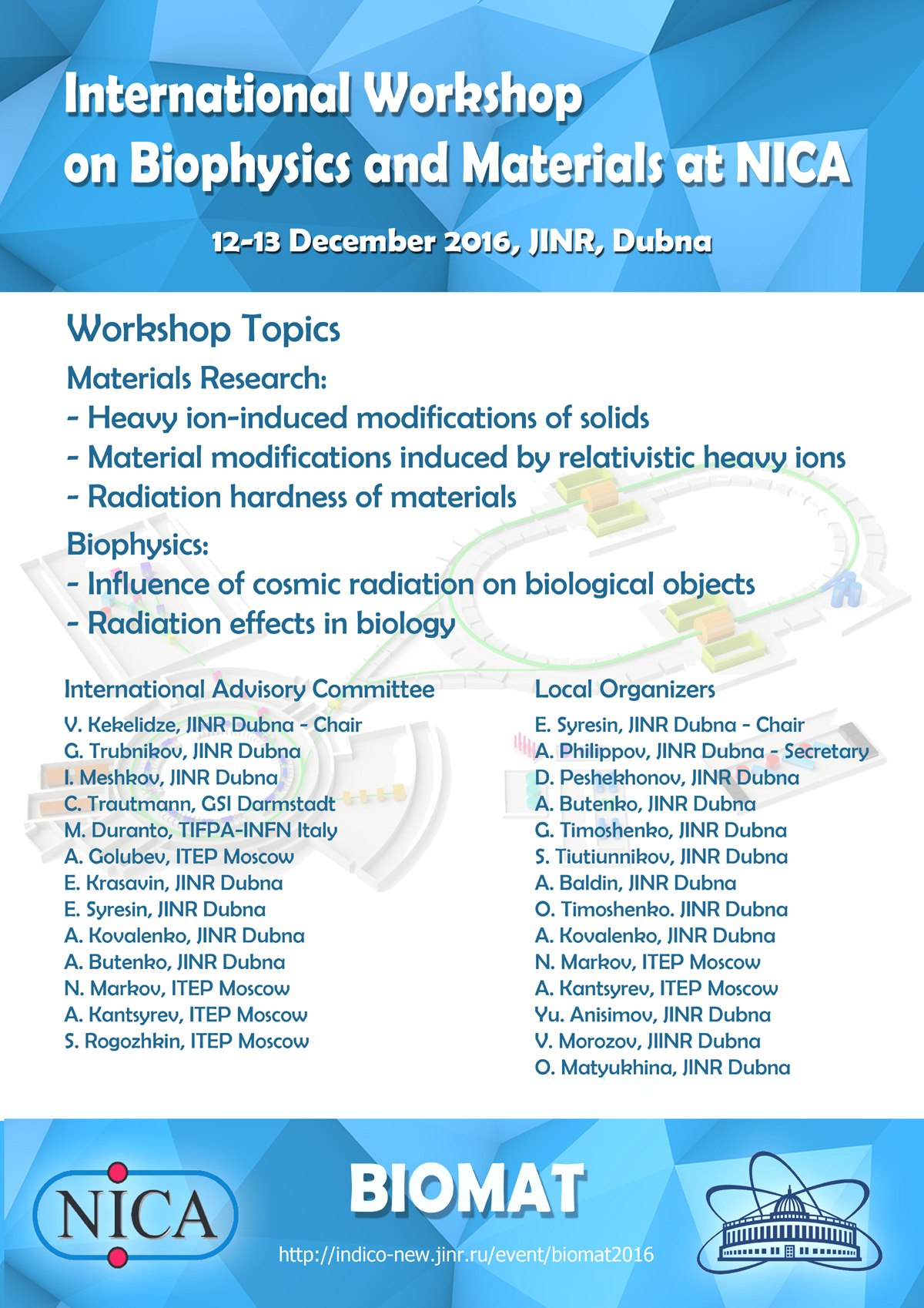 The International Workshop on Biophysics and Materials at NICA «BIOMAT» will be held on 12-13 December 2016 in the Veksler and Baldin Laboratory of High Energy Physics JINR, Dubna.