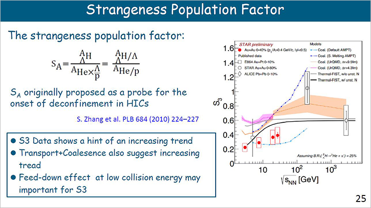 Zhang Yapeng from the Institute of Modern Physics (Lanzhou, China) presented an overview of new results from the STAR collaboration on the formation of light nuclear clusters and hypernuclei in nucleus-nucleus collisions. It was noted that no theoretical model is able to simultaneously give satisfactory description of the rapidity distribution of light nuclei and their average transverse momentum. At the same time, the coalescence model makes it possible to quite successfully adjust individual characteristics of momentum distributions. It was shown that the statistical model describes the ratio of the number of protons to deuterons p/d well, but it overestimates the t/p and Λ3H/Λ ratios.
