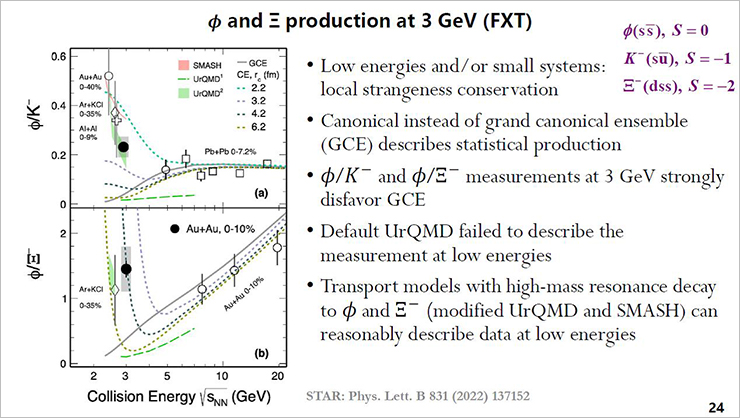 Zhu Xianglei from the Huzhou University (China) delivered the report on the systematics of the production of strange particles and showed new data from the STAR experiment on the production of ϕ-mesons. The ratios ϕ/K— and ϕ/Ξ— show a strong effect of canonical strangeness suppression.
