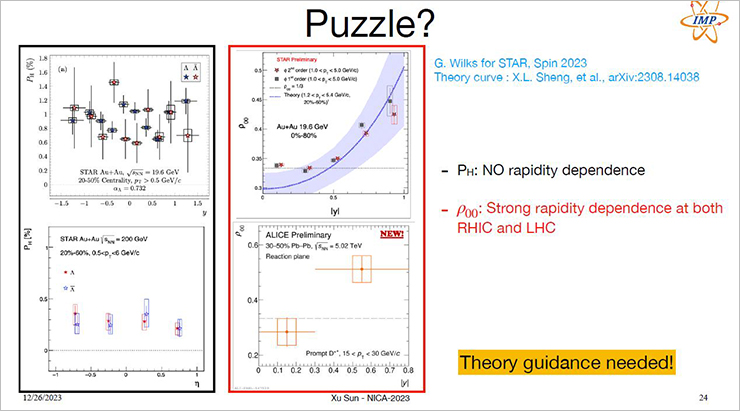 Sun Xu from the Institute of Modern Physics (Lanzhou, China) spoke about an interesting and as yet unexplained phenomenon: the polarisation of hyperons depends significantly less on the particle velocity than the polarisation of vector mesons.