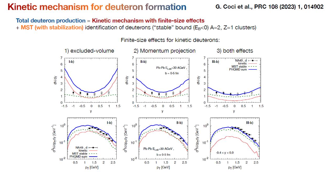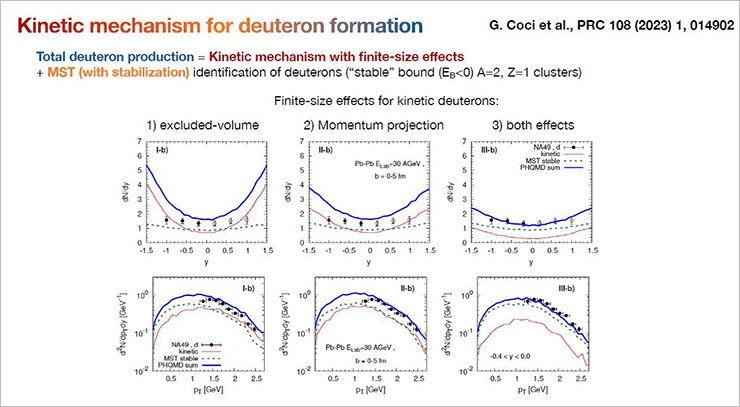 Several reports were devoted to the issues of cluster formation in collisions. Viktor Kireev (JINR) described how the cluster formation is implemented in the PHQMD transport model. Clusters are formed dynamically in it due to the potential interaction between nucleons and hyperons and are identified using the MST (Minimum Spanning Tree) model. For deuteron formation, a kinetic approach is used, involving the full isospin set of hadronic reactions, which enhances the formation of d.