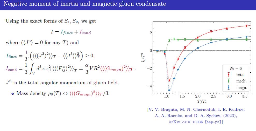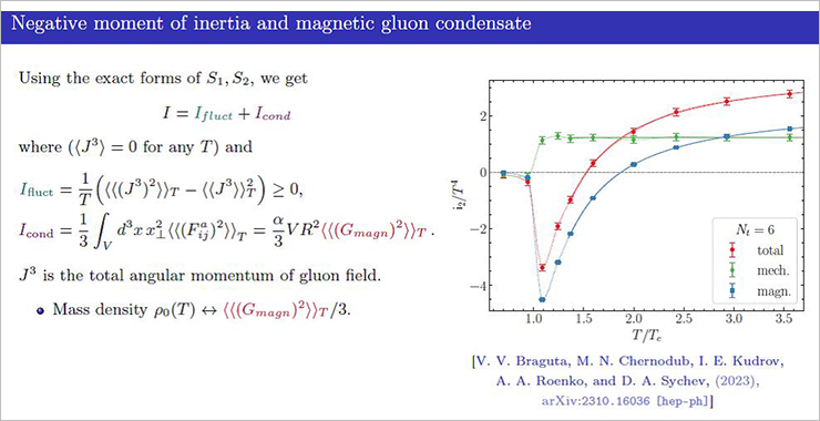 The properties of quark-gluon matter under solid rotation can be studied in lattice QCD simulations. Artem Roenko (JINR) presented the results of such calculations at the workshop. It turns out that isothermic moment of inertia of plasma becomes negative in the temperature range above the critical temperature Tc, up to ~1.5Tc, and is positive at higher temperatures.