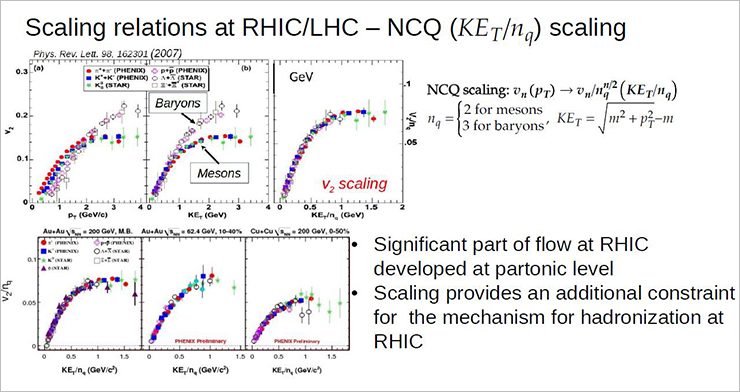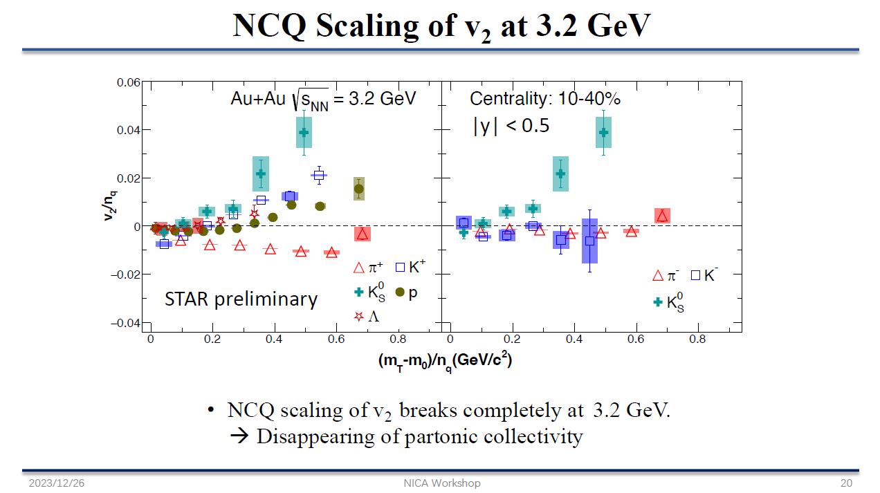 The topic of anisotropic flows was also touched upon in the talk by Liu Zuowen from the Central China Normal University, who discussed new results from the STAR experiment for Au+Au collisions at energies of √s = 3–19.6 Gev. A negative direct flow is observed for ?+ and ? at low transverse momenta (pT < 0.6 GeV/c). This can be explained by the effect of interaction of particles with spectator nucleons. The NCQ scaling of elliptical flow, v2, is detected at collision energies of 14.6 GeV and above and breaks down at 3.2 GeV and below.