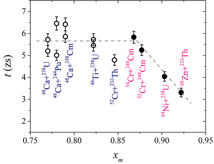 Fig. 1. The estimated time for asymmetric quasifission processes for the studied reactions in comparison with those obtained for the reactions of 48Ca and 48Ti ions with actinide nuclei as a function of the mean fissility parameter. The dashed lines guide the eye.