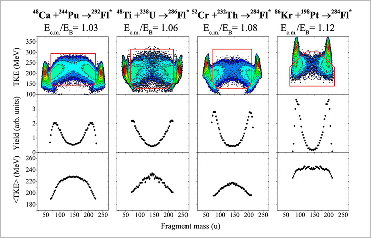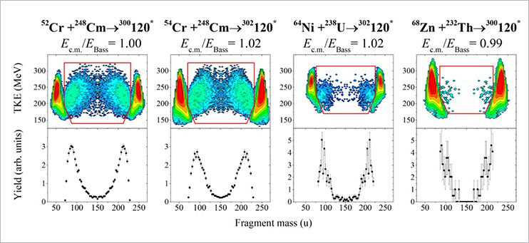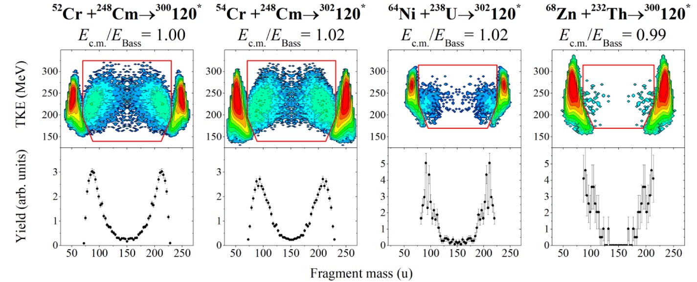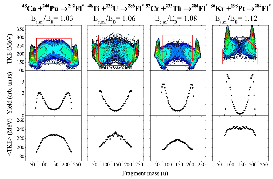 Mass-total kinetic energy distributions of the binary fragments obtained in the studied reactions are shown in Figures 2 and 3. The fissionlike products within the contour lines are characterized by large mass transfer and energy dissipation and can originate either from compound-nucleus fission or quasifission processes. It should be noted that the fission and quasifission fragments have similar properties that makes difficult to separate them.