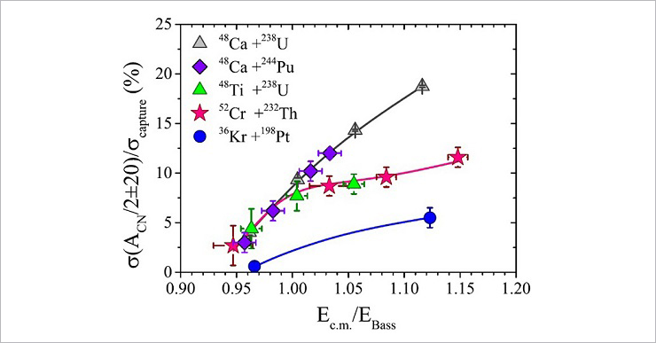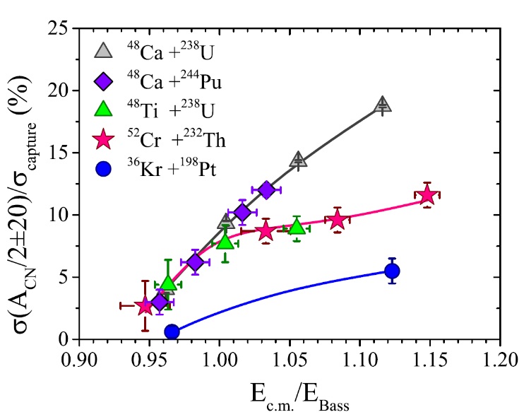 Moreover, we found that the properties of symmetric fragments change significantly at the transition from 48Ca ions to 48,50Ti (Fig. 3) and 52,54Cr (Fig. 2) ions. In the case of 64Ni- and 68Zn-induced reactions (Fig. 2), these changes are drastic. It was shown [6, 8] that at energies above the barrier, the contribution does not change with increasing interaction energy and is about 5–6% for the reactions with 52Cr ions, contrary to the reactions involving actinide nuclei and 48Ca ions, where the contribution of symmetric fragments increases monotonically. This may indicate a significant increase in the quasifission process at the transition from 48Ca to 48Ti and 52Cr ions (Fig. 4). Thus, for the nuclear systems with Z1Z2 > 2000, the quasifission is a dominant process even in the formation of symmetric fragments.