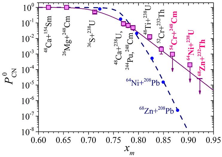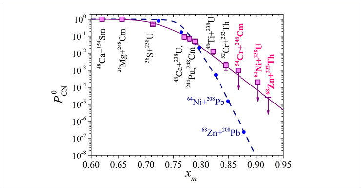 A comparative analysis performed in the papers presented for the competition [6–9] with the results obtained earlier for the reactions with 36S, 40,48Ca, 48,50Ti, 58Fe, and 64Ni ions allowed us to evaluate fusion probabilities in the wide range of Coulomb factor Z1Z2 from 1472 to 2808. The measurements were carried out at the Flerov Laboratory of Nuclear Reactions, Dubna, and the Physics Department of the Jyväskylä University, Finland, using the double-arm time-of-flight spectrometer CORSET [10].
