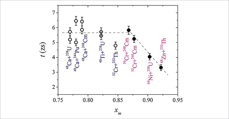 The investigations [6, 8] showed that in the case of the reactions with 48Ti and 52,54Cr ions the properties of asymmetric quasifission fragments are similar to those obtained in the reactions with 48Ca ions with the reaction time of about 5–7×10-21s (see Fig. 1). However, shorter reaction times of about 3×10-21 s were observed in the case of Ni and Zn ions, probably, due to the strong Coulomb repulsion between interacting nuclei, which leads to the rather quick decay of the formed dinuclear system.