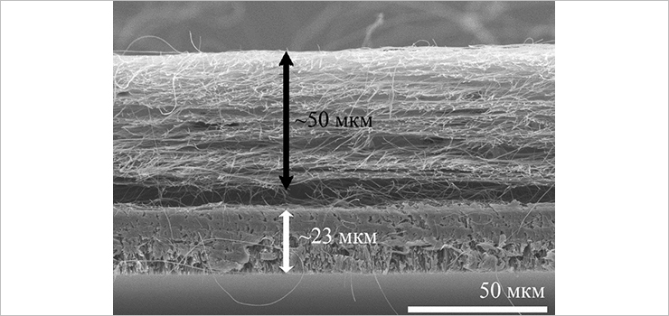 Микрофотография среза композитного материала с заданными медико-биологическими свойствами (черная двунаправленная стрелка – нановолоконный слой, белая двунаправленная стрелка – ПЭТФ ТМ + Ti)