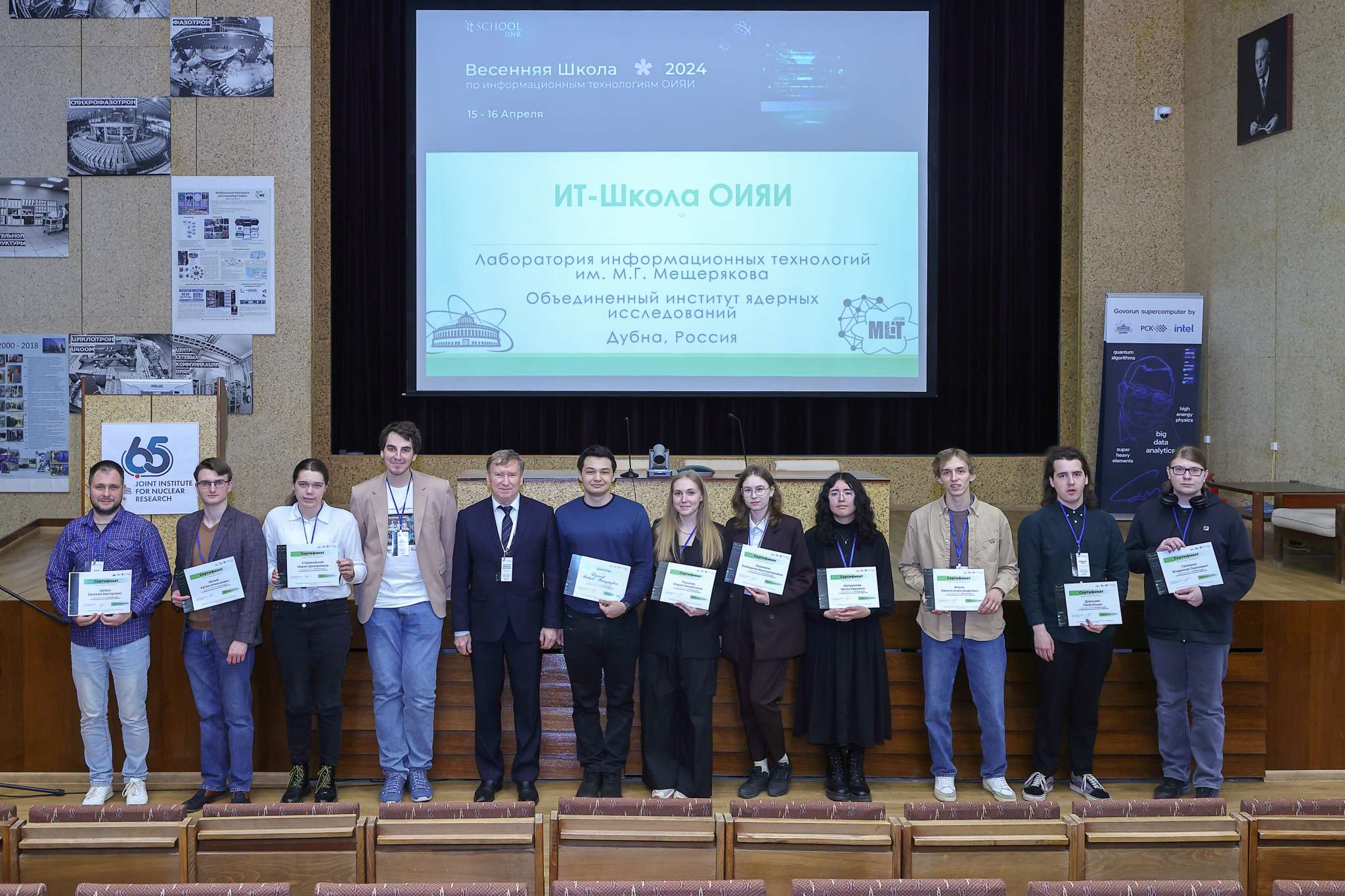 15-16 апреля в Лаборатории информационных технологий им. М. Г. Мещерякова прошла Весенняя школа по информационным технологиям Объединенного института ядерных исследований. Мероприятие является вторым этапом в серии школ по информационным технологиям ОИЯИ, главной целью которых является вовлечение молодых специалистов в решение задач, стоящих перед ОИЯИ, с применением современных информационных технологий. По итогам Осенней школы, которая проходила с 16 по 20 октября 2023 года в ЛИТ ОИЯИ, были сформированы научные группы, включающие в себя студентов, их руководителей из вузов и сотрудников института для совместных работ в проектах ОИЯИ.