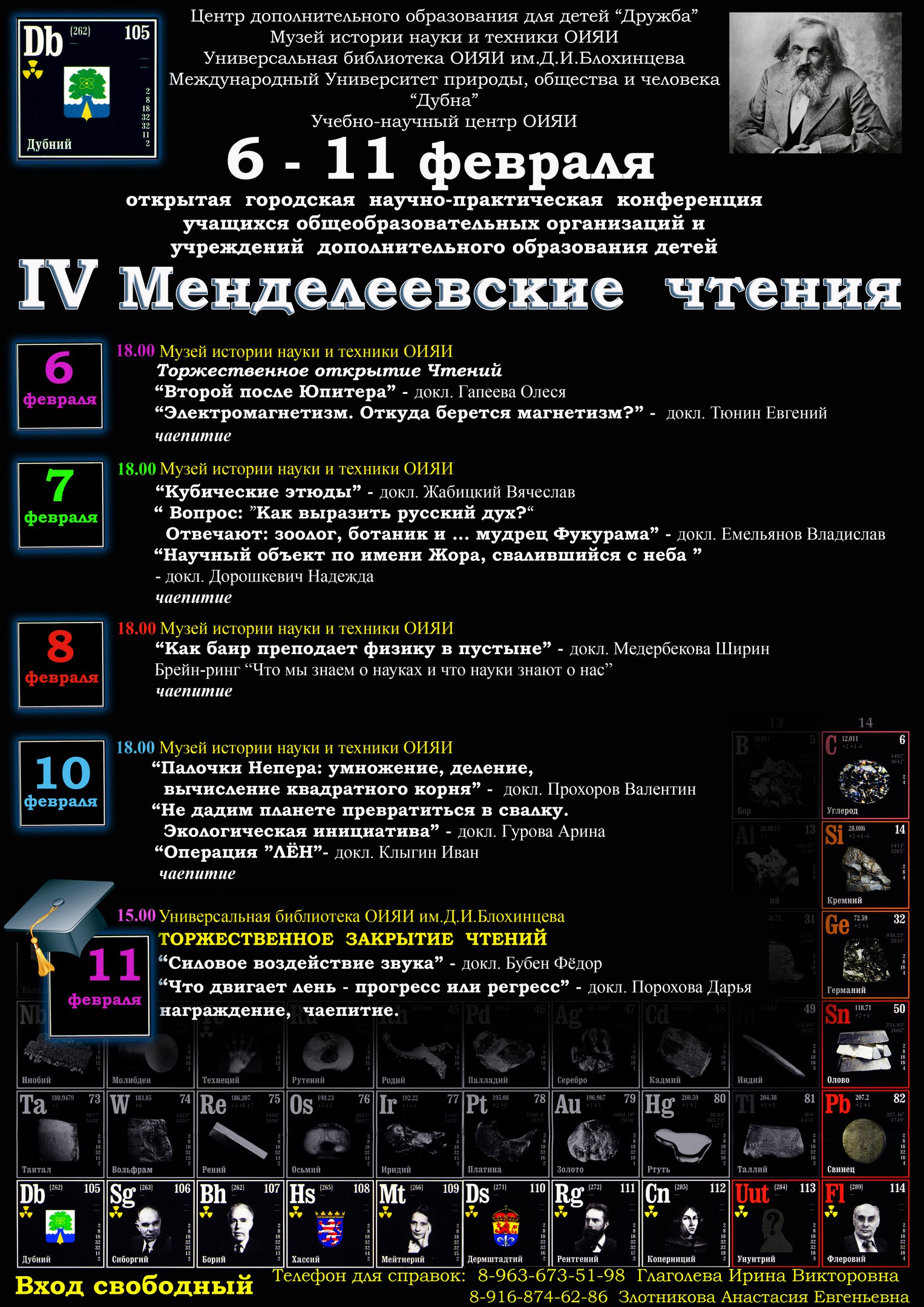 С 6 по 11 февраля 2017 г. в Музее истории науки и техники ОИЯИ пройдет научно-практическая конференция школьников «IV Менделеевские чтения».