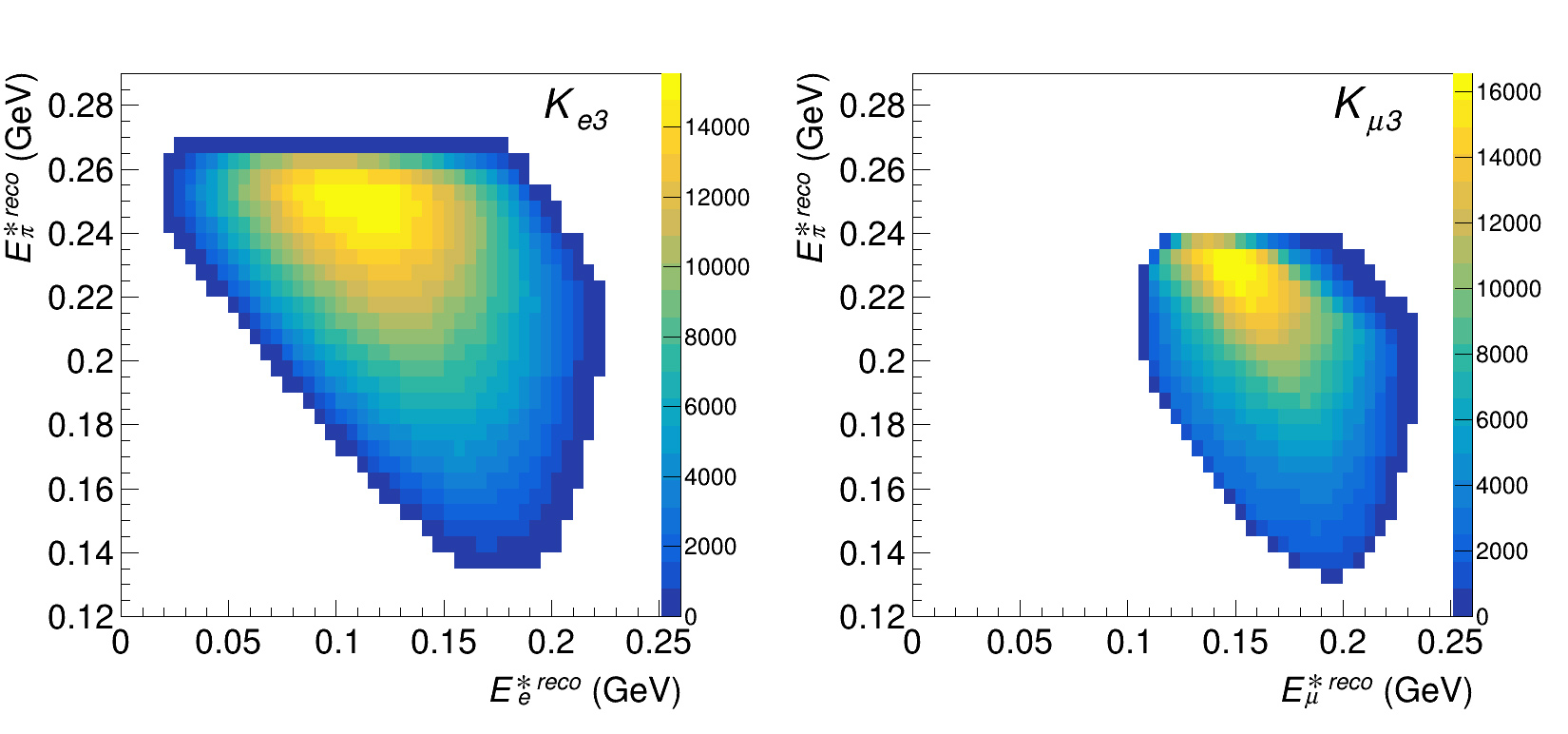 Рис. 1: распределения по измеренным энергиям пиона и лептона в системе центра масс каона для отобранных событий K±l3 распадов (Далиц-плоты)