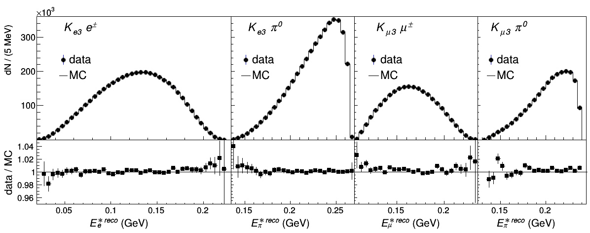 Далиц-плоты отобранных событий показаны на рис. 1. После поправки на фон они были использованы для извлечения параметров форм-факторов путем фитирования. Полная статистика отобранных событий составила 4.4∙106 для Ke3 и 2.3∙106 для Kμ3. Наибольшие вклады в фон дают распады каона на π±π0 и π±π0π0 (0.6∙10-3 и 2.5∙10-3 для Ke3 и Kμ3 соответственно). Для наглядной оценки качества фита на рис. 2 приведены экспериментальные распределения по энергии пиона и лептона в системе центра масс каона после вычитания фона вместе с результатами фитирования с использованием параметризации Тейлора для описания форм-факторов.