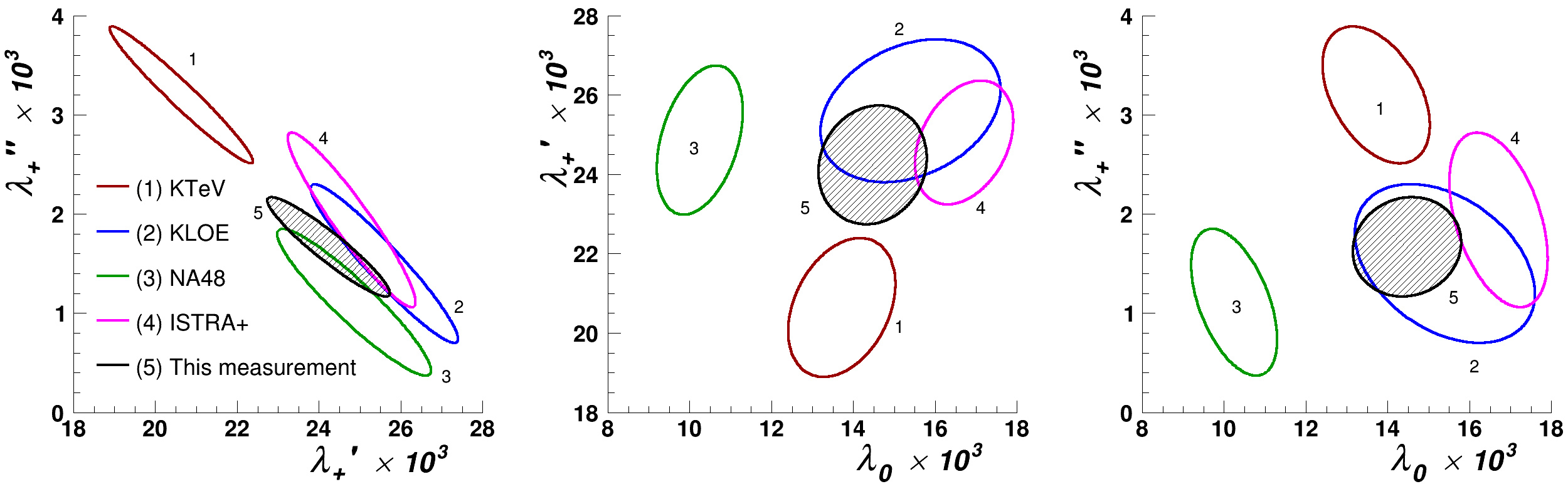 На рис. 3 представлены результаты объединенного измерения для Ke3 и Kμ3 в NA48/2 и их сравнение с соответствующими результатами экспериментов KTeV, KLOE, NA48 и ISTRA+. Полученные результаты согласуются с признанными измерениями других экспериментов. Комбинированный результат настоящей работы для Ke3 и Kμ3 является наиболее точным на текущий момент.
