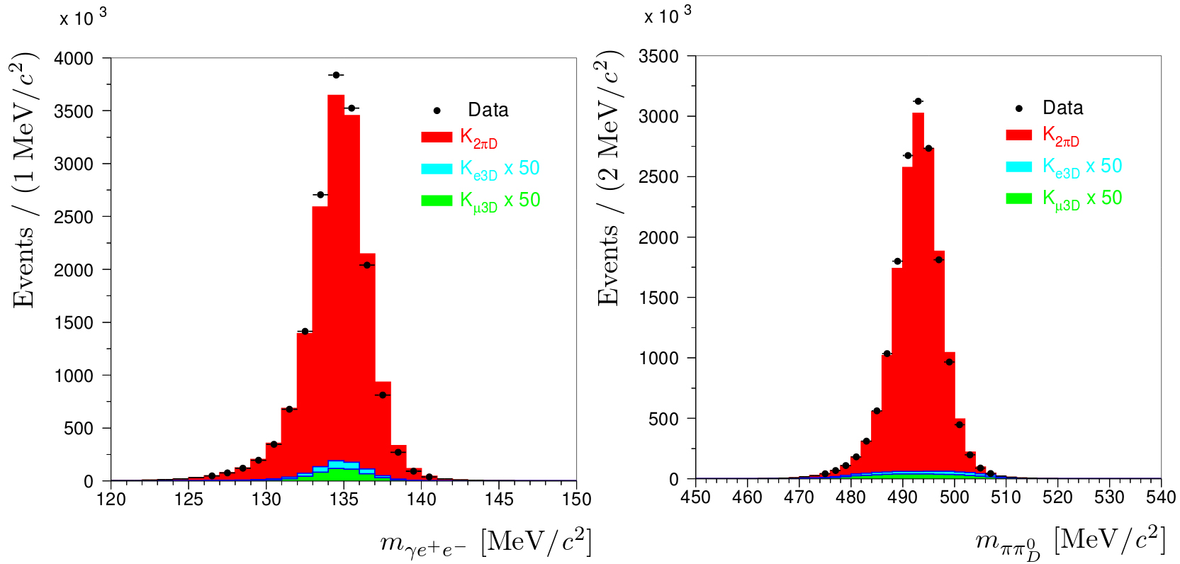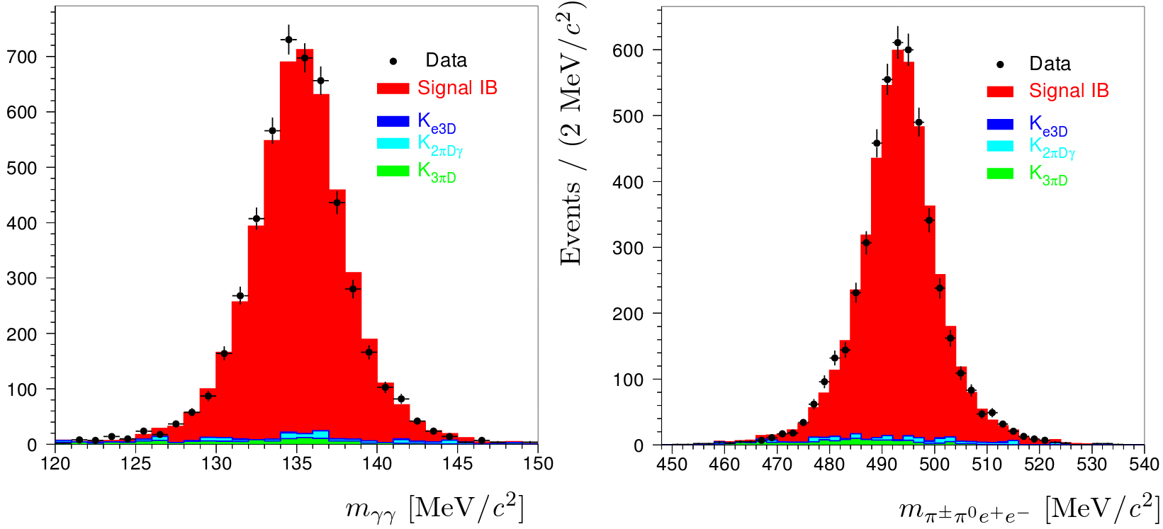 В качестве нормализационного процесса для измерения относительной вероятности распада K±→π±π0e+e— был выбран распад K±→π±π0D. Было отобрано 16.3∙106 кандидатов в этот распад. Оценка фона в сигнале π±π0e+e— составила 4.9%, фон для нормализационного канала π±π0D составил 0.11%. Для сигнала реконструированные распределения масс π0→γγ и K±→π±π0e+e— по эффективным массам показаны на рисунке 4. На рисунке 5 приведены аналогичные распределения масс π0→γe+e— и K±→π±π0D для нормализационной моды.