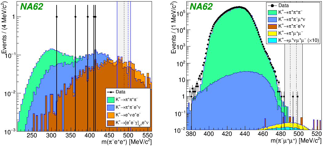 В рамках стандартной модели нейтрино имеют нулевую массу, но открытие нейтринных осцилляций показало, что массы нейтрино отличны от нуля. Это мотивирует поиск процессов, нарушающих сохранение лептонного числа, поскольку их наблюдение позволяет установить майорановскую природу нейтрино. На рис. 6 для отобранных событий из экспериментальных данных и смоделированных источников фона показаны распределения восстановленных масс систем K+→π—e+e+ и K+→π—μ+μ+. Ожидаемый фон в области сигнала составил 0,16 ± 0,03 и 0,91 ± 0,41 событий, а количество реально наблюдаемых событий в данных – 0 и 1, соответственно. Этот факт позволил установить верхние пределы на парциальные ширины данных распадов 2,2 ∙ 10-10 и 4,2 ∙ 10-11 на уровне достоверности 90%, соответственно. Полученный результат привел к уточнению мировых данных по возможному несохранению лептонного числа. Анализ данных 2018 года позволит улучшить чувствительность.