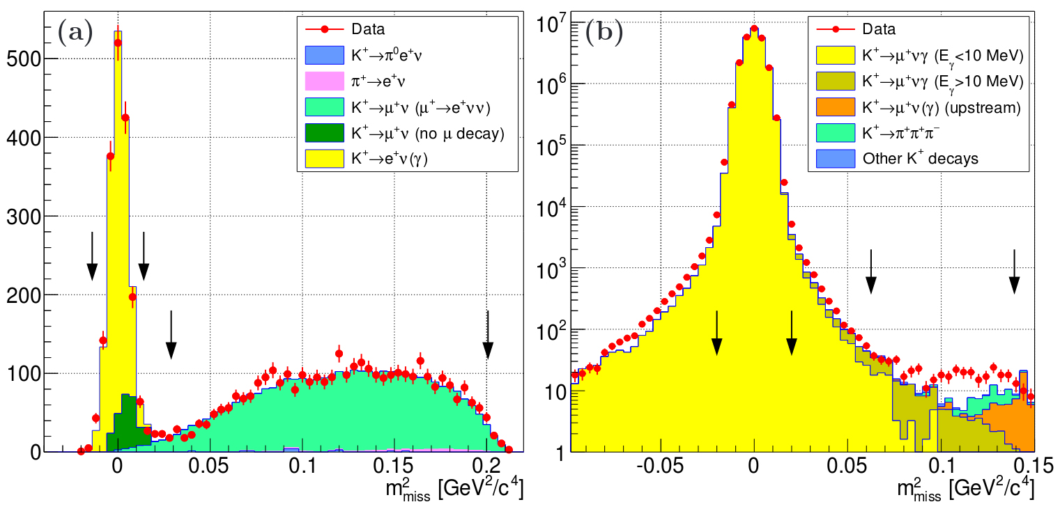 На рисунке 7 показаны распределения по квадрату недостающей массы для отобранных событий в экспериментальных данных и в результатах моделирования. Поиск сигнала HNL проводился в интервале, обозначенном на рисунке стрелками: 0.03–0.20 ГэВ2/c4 для e+ и 0.06–0.14 ГэВ2/c4 для μ+. Поиск распада K+→l+N состоял в попытке обнаружения пика над фоном в предполагаемой области масс HNL.