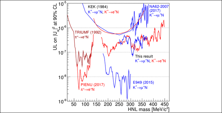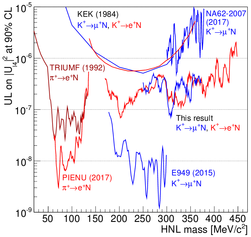 Полученные верхние пределы на |Ul4|2 при доверительном уровне 90% показаны на рисунке 8 вместе с результатами предыдущих исследований HNL-процессов в распадах π+ (TRIUMF, PIENU) и K+ (KEK, E949, NA62-2007). Новый результат улучшает ранее полученные ограничения на |Ue4|2 при массах выше 300 МэВ/с2.
